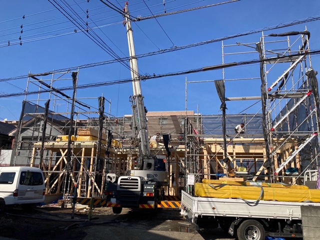 ↓ 1階の柱どうしを梁でつなぎ、2階の床を組んでいます。