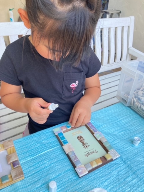 小さな手で一生懸命に接着剤を付け、上手にフレームの上に置いていました。
