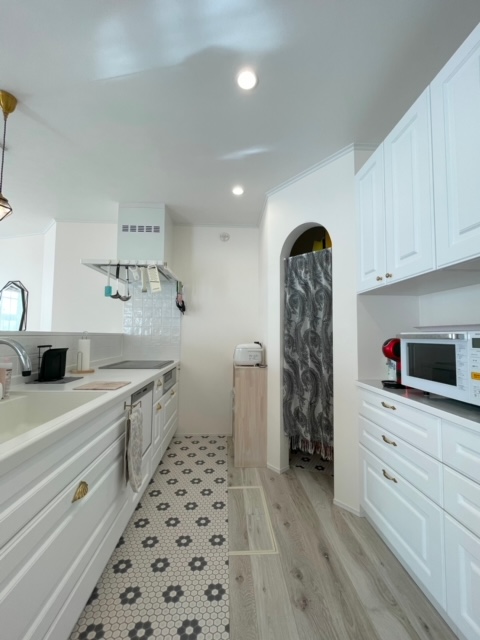 カップボードもホワイトに揃えた I型キッチン、