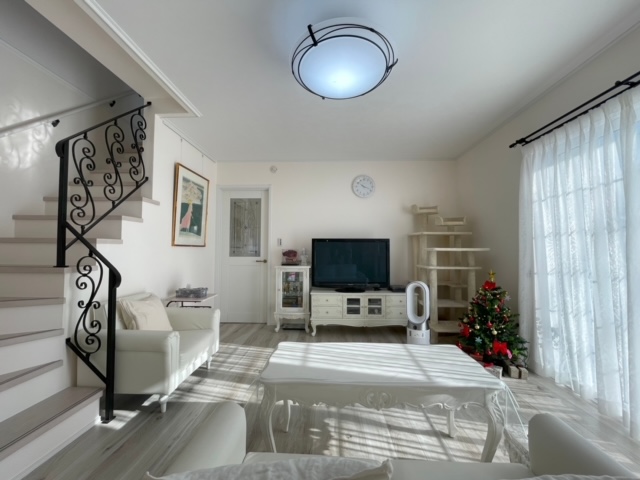 白を基調としたおしゃれな内装のリビング。家具もホワイトで統一感 UP!