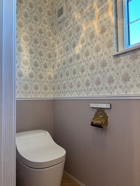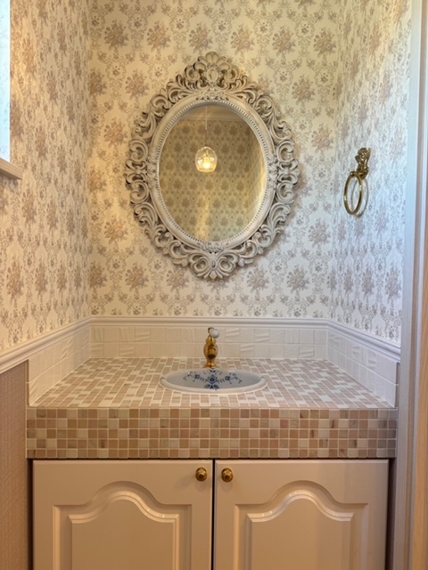 ↓ : フラワークロスと腰壁をコーディネートした洗面化粧室 ⿻*