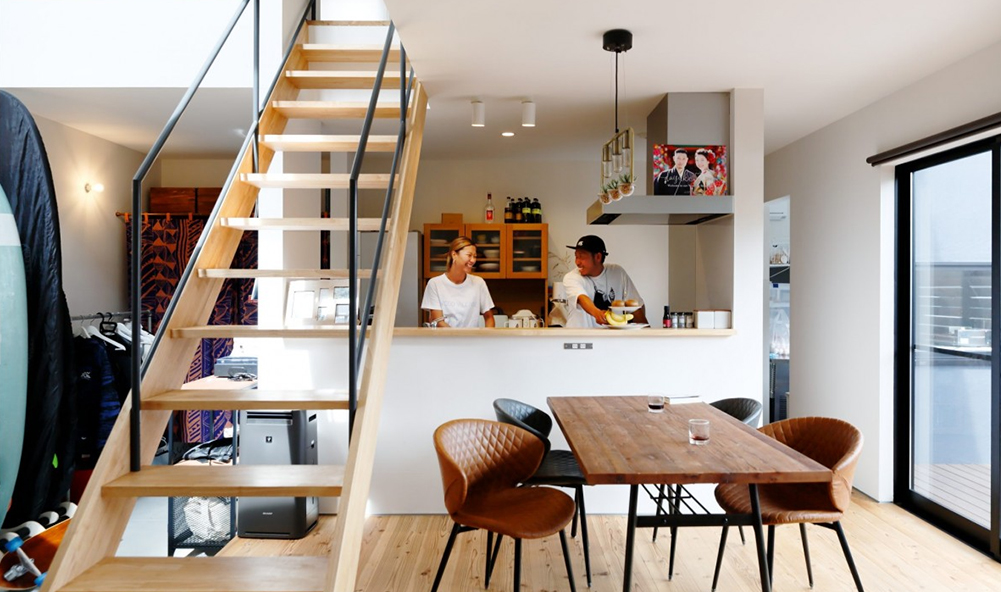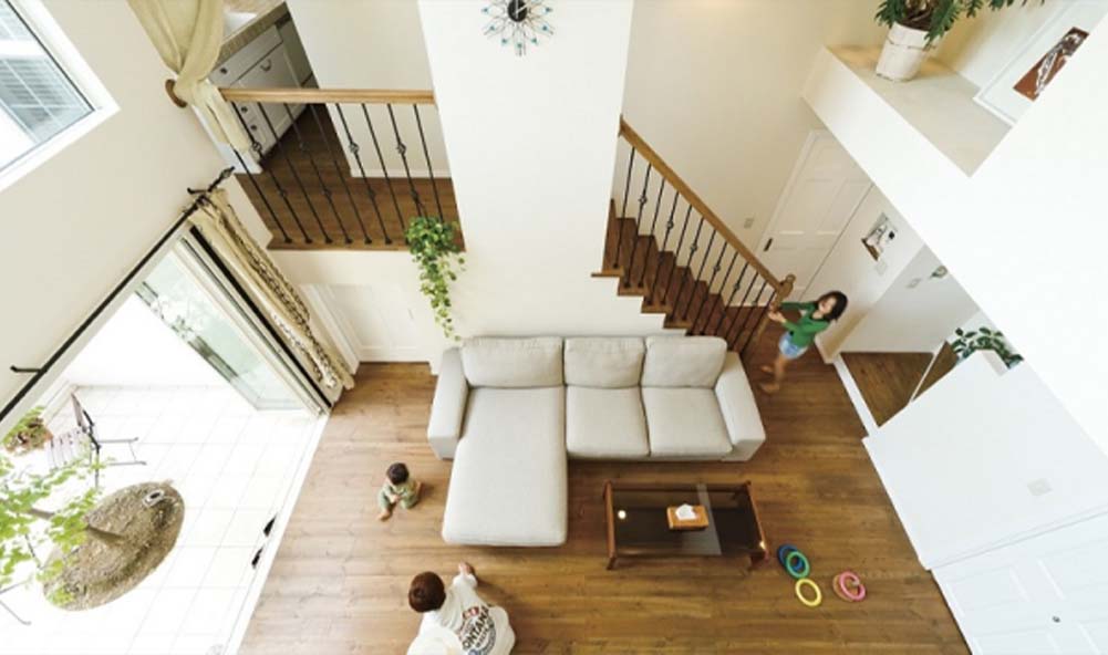 大きな吹き抜けと開口部から差し込む自然光、風が抜ける構造は、他にはない開放感を実現しています。