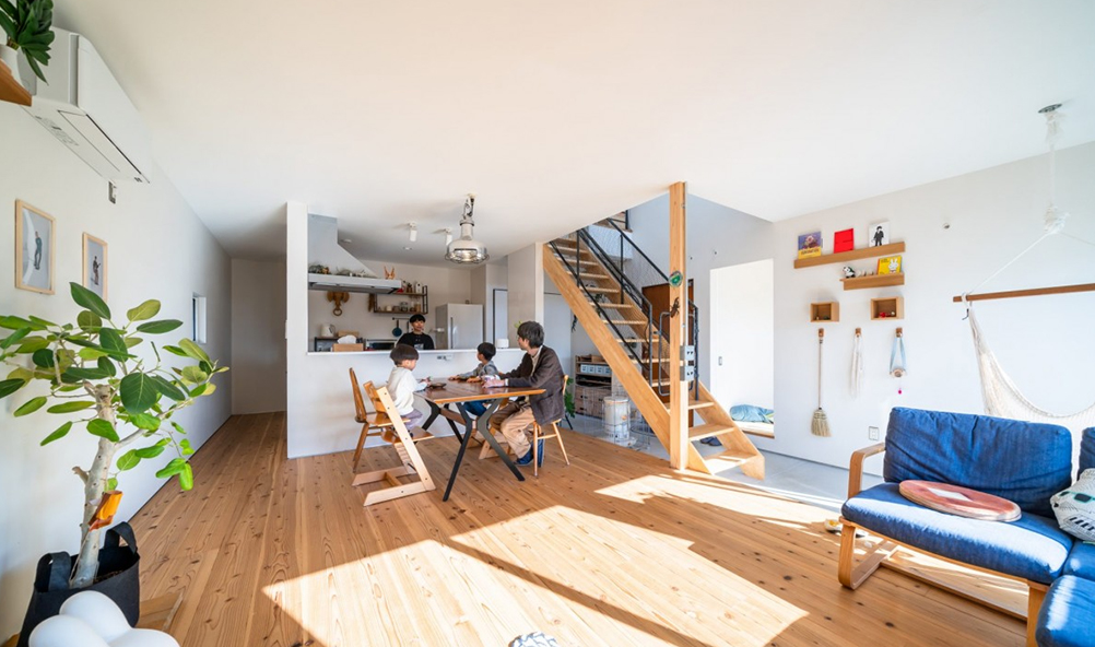 無垢のフローリングや塗り壁など、化学物質を極力使わない自然素材の家。呼吸するように湿度を調整し、空気まで心地いい。