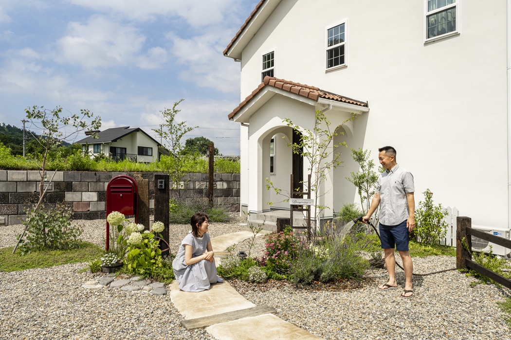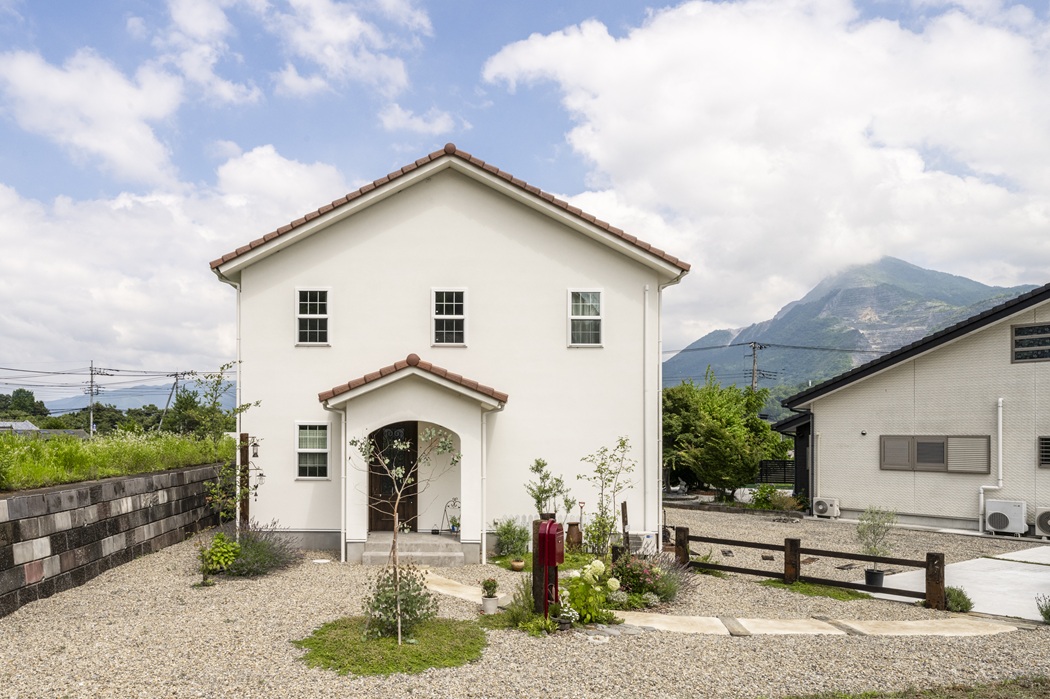玄関ポーチのアーチや赤いポストがアクセントになり、絵本のような佇まいに。