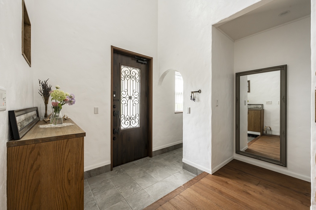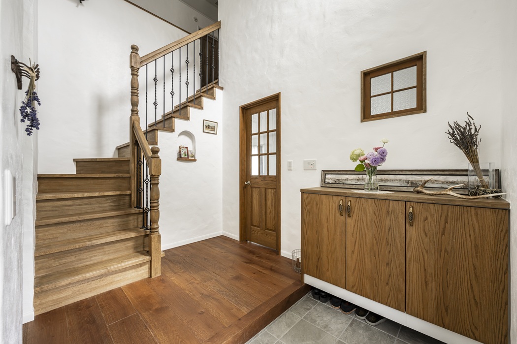 吹抜け玄関と漆喰の壁が生み出す、おとぎ話のような空間