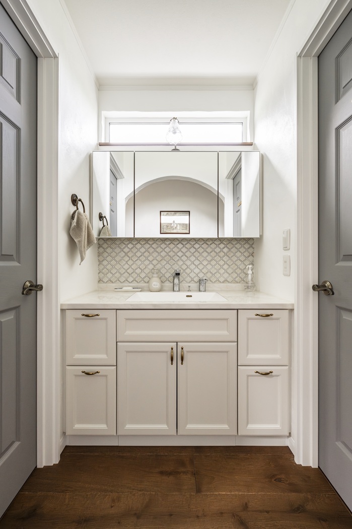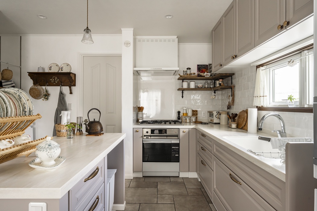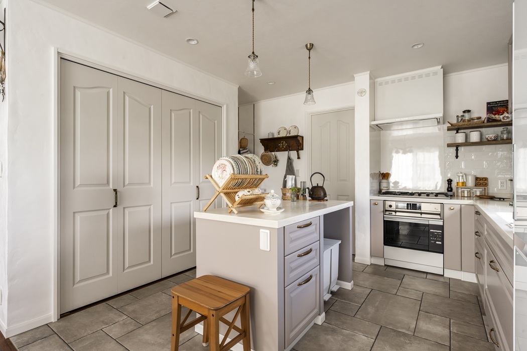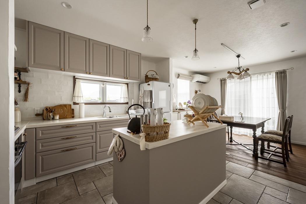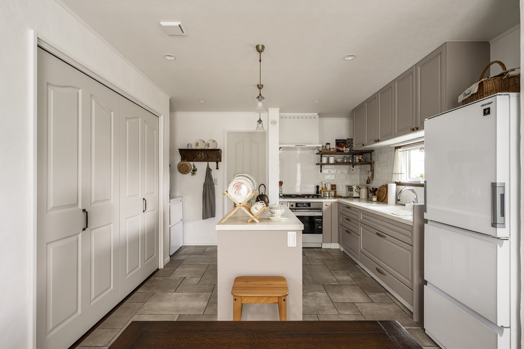 グレージュの扉色や陶器のような取っ手など、細部までこだわりが詰まっています。