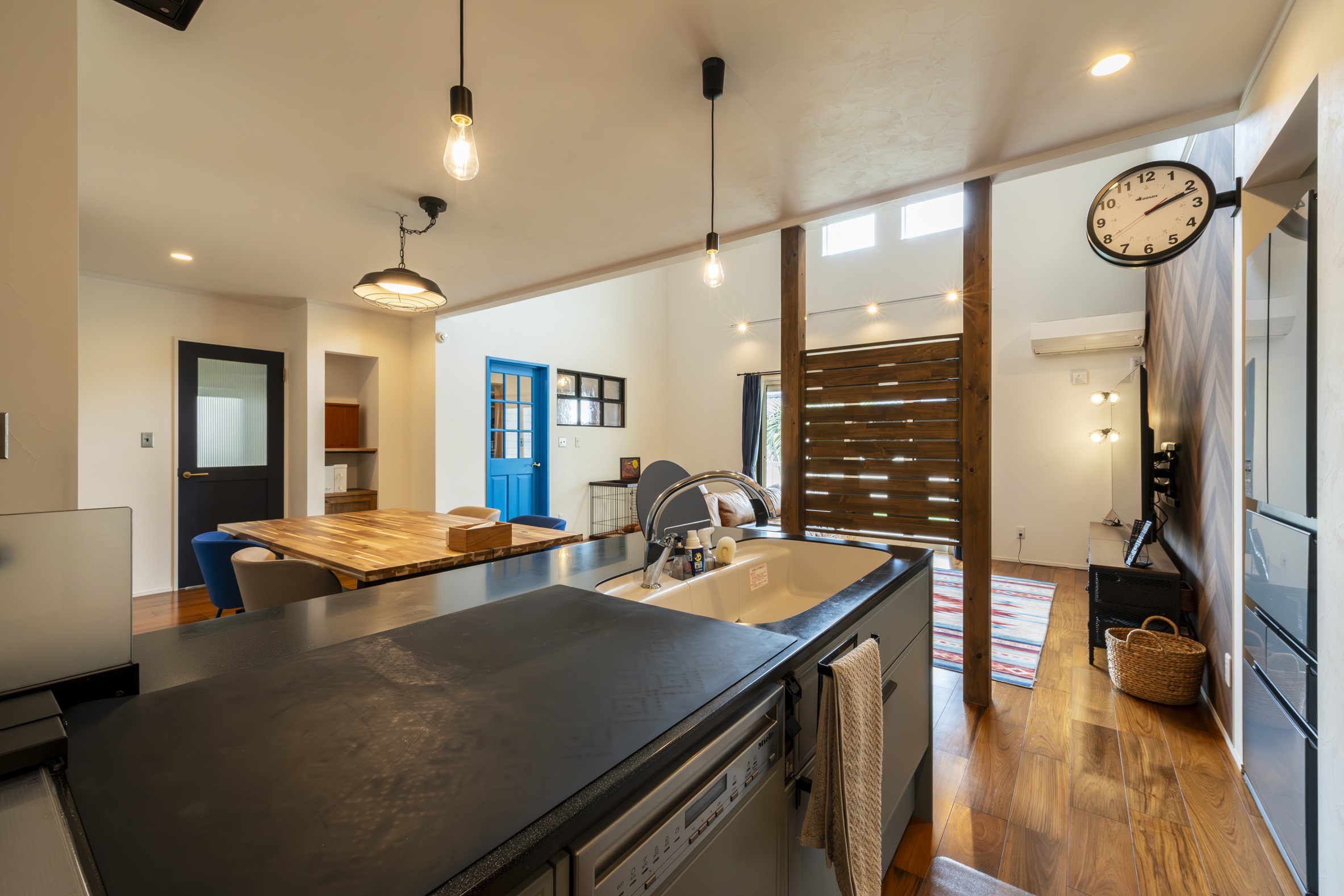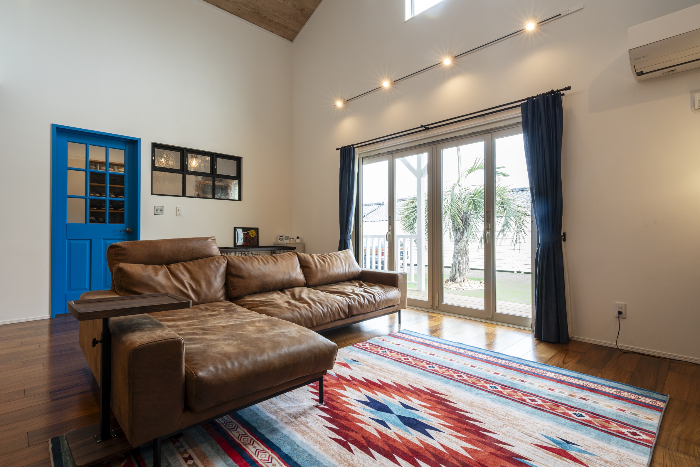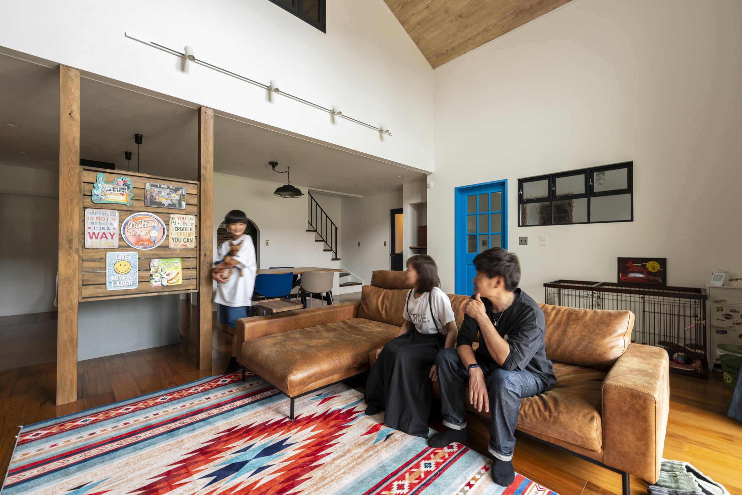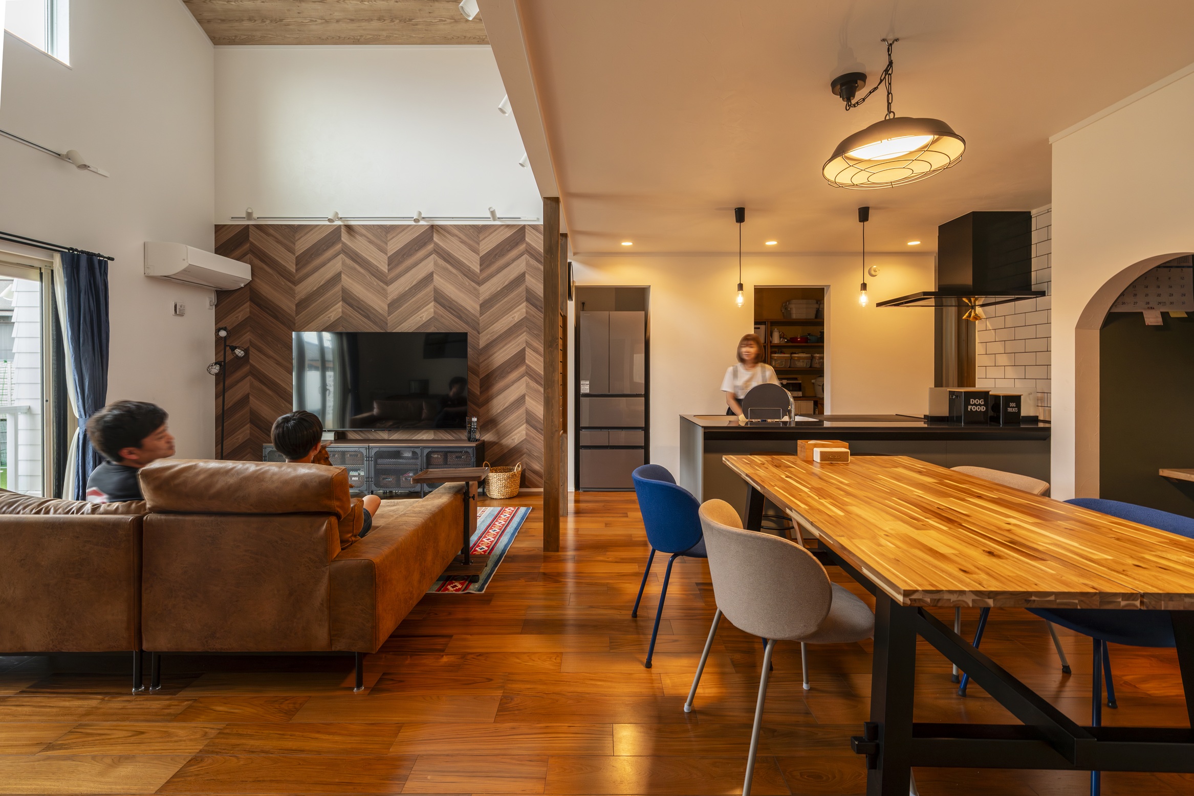テレビ背面のヘリンボーン柄の壁や、アクセントになるブルーの建具など、アメリカンカルチャーへの愛が詰まっています。