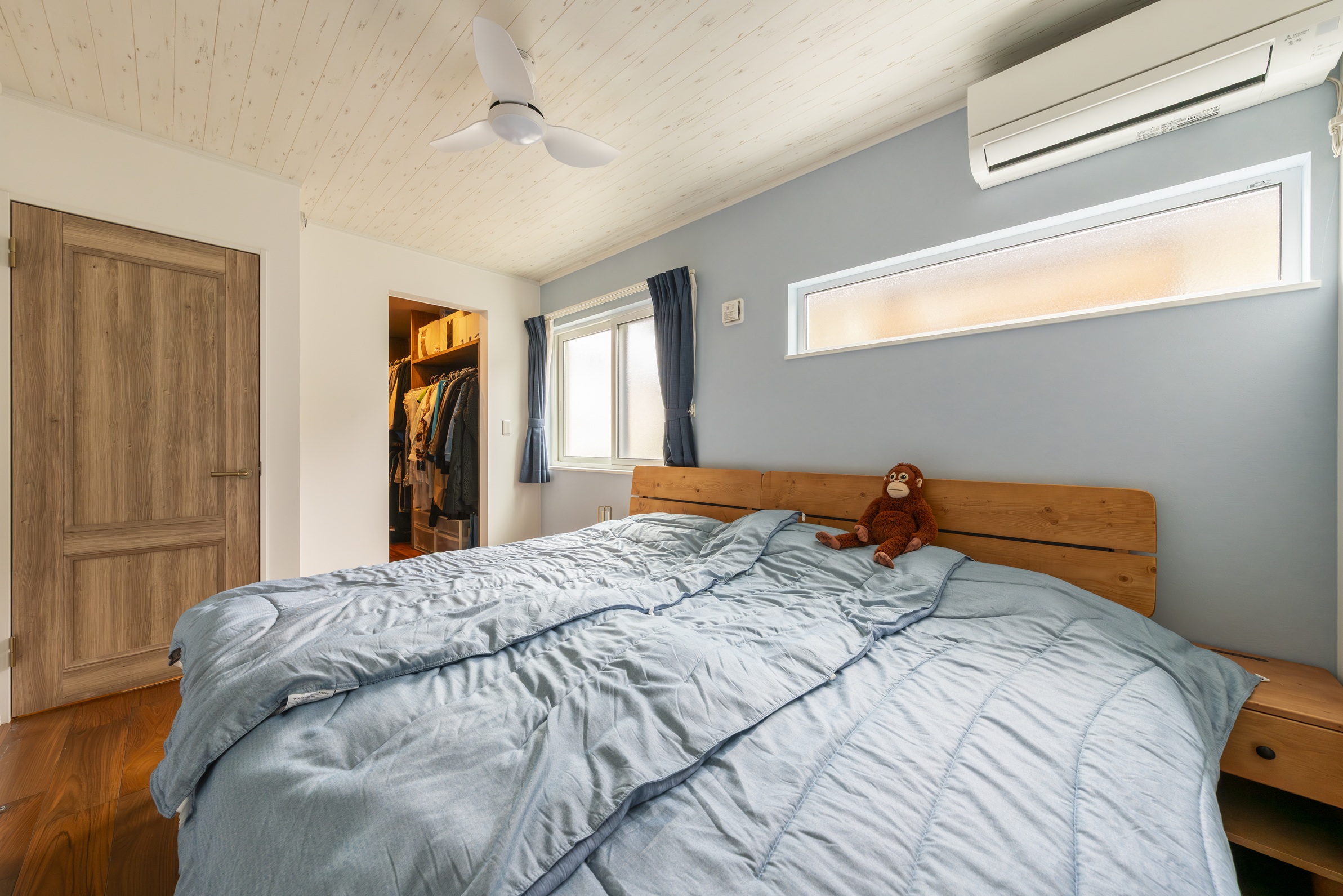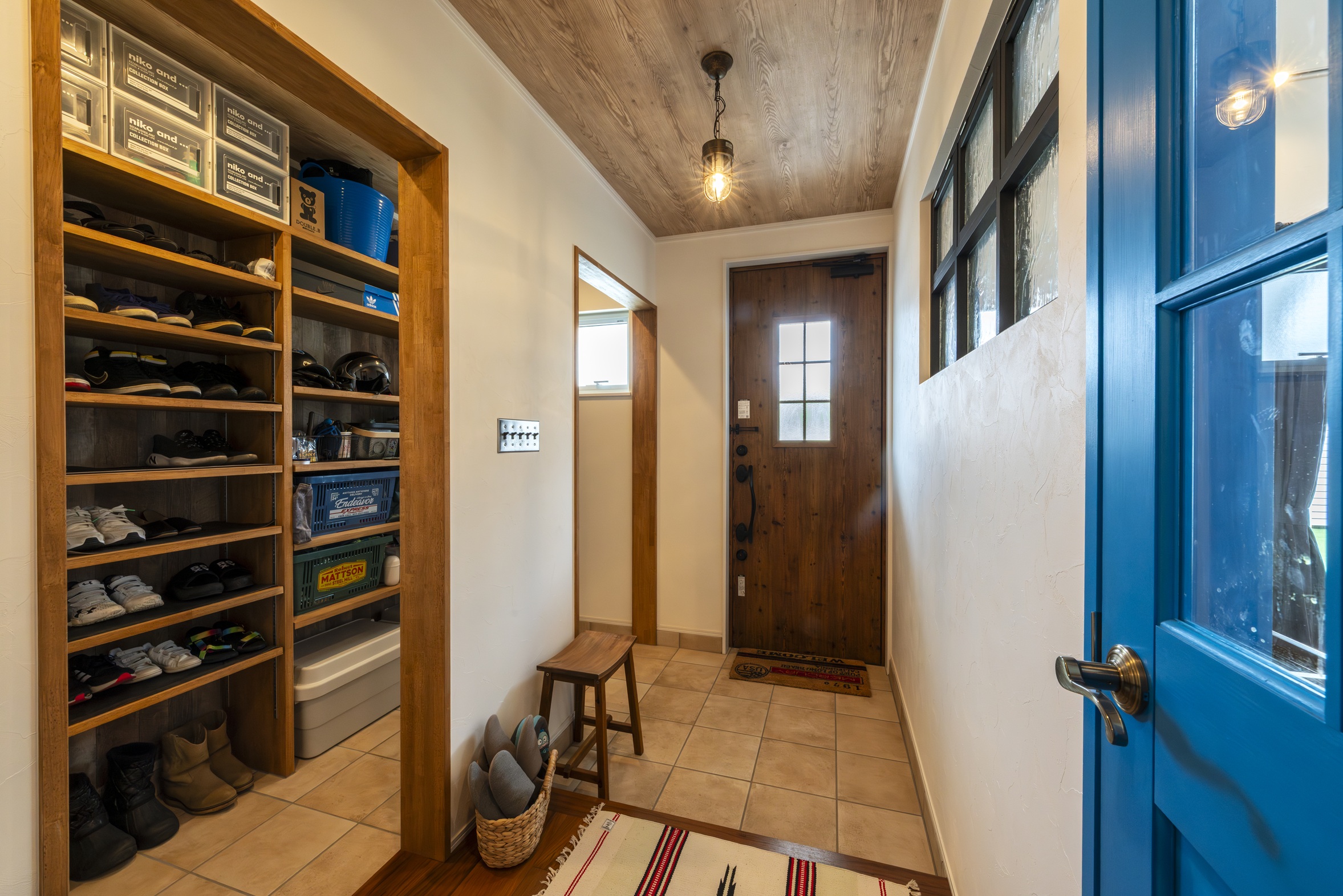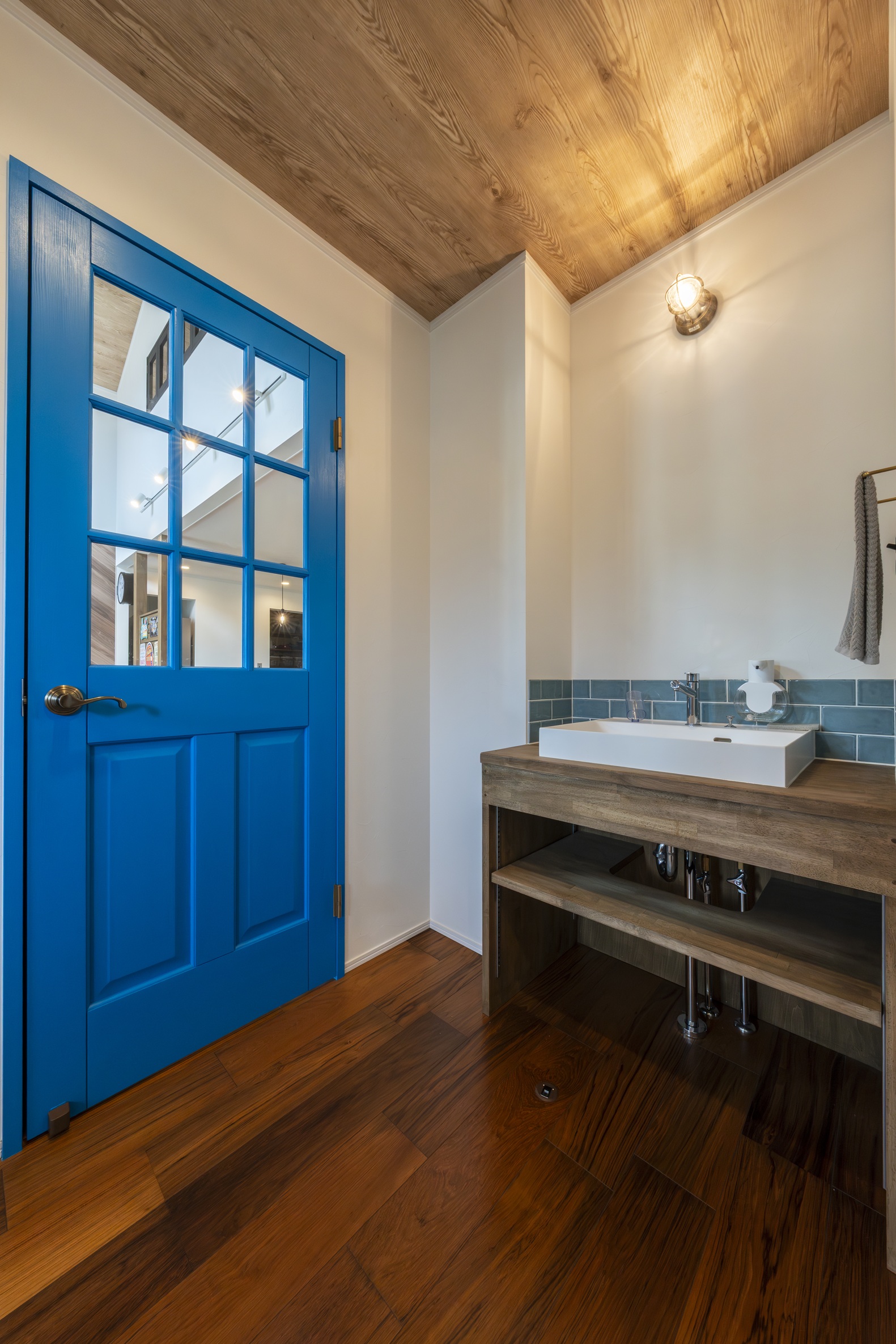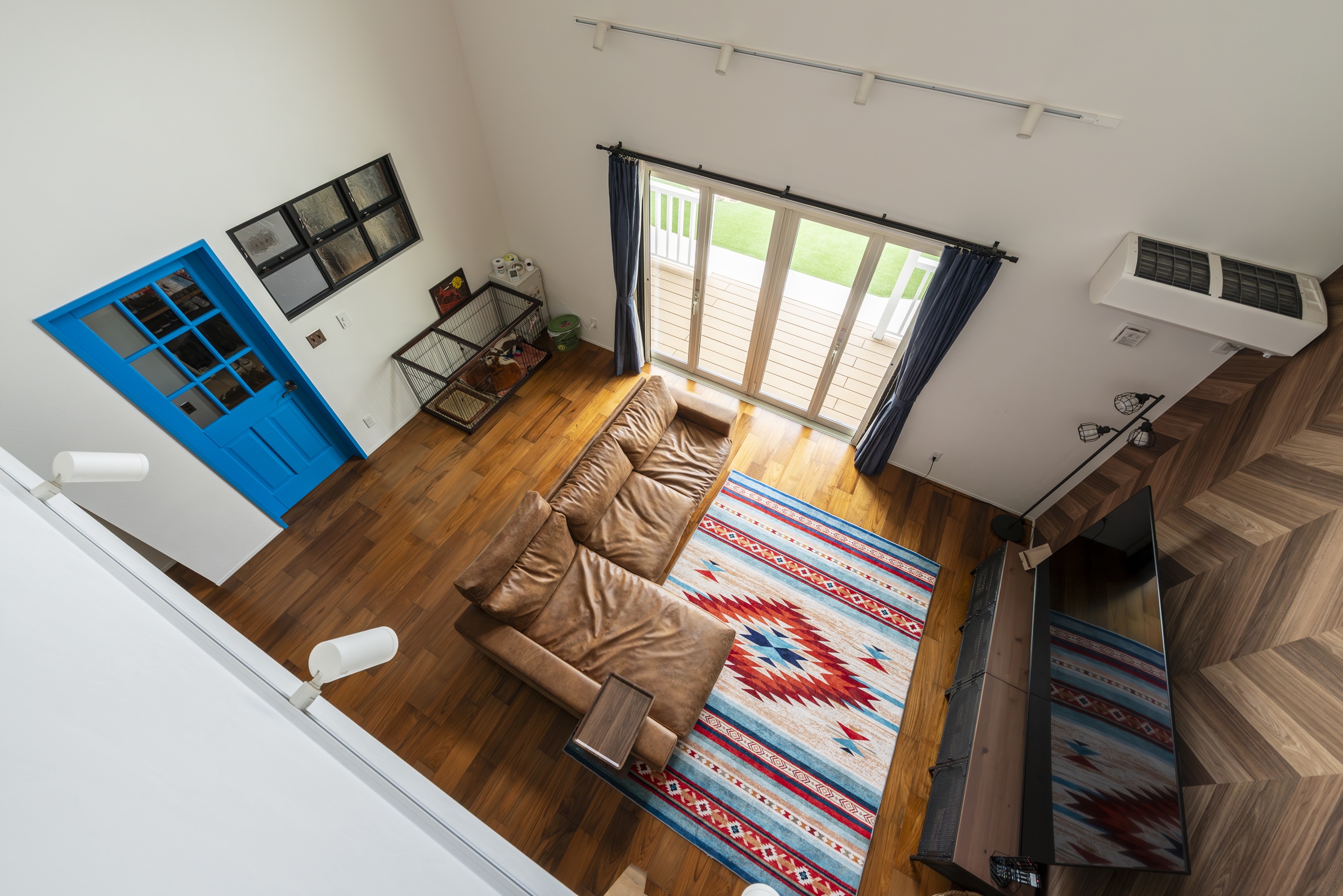 テレビ背面のヘリンボーン柄の壁や、アクセントになるブルーの建具など、アメリカンカルチャーへの愛が詰まっています。