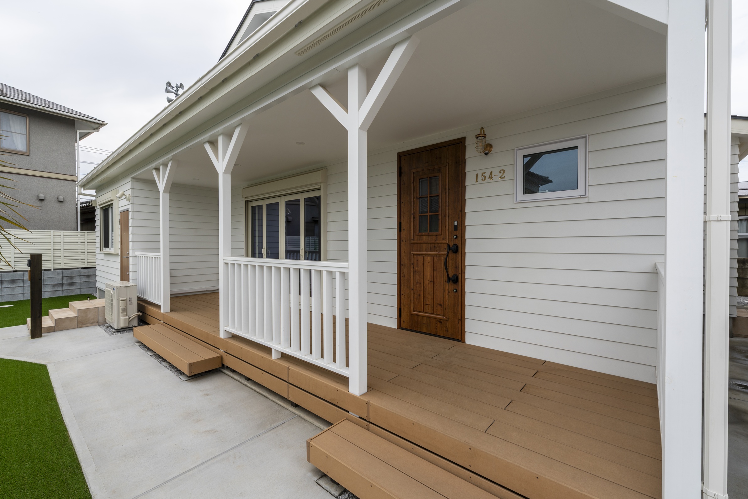ヴィンテージカーやバギーが映える外観は、白のラップサイディングにカバードポーチを組み合わせた本格アメリカンテイスト。