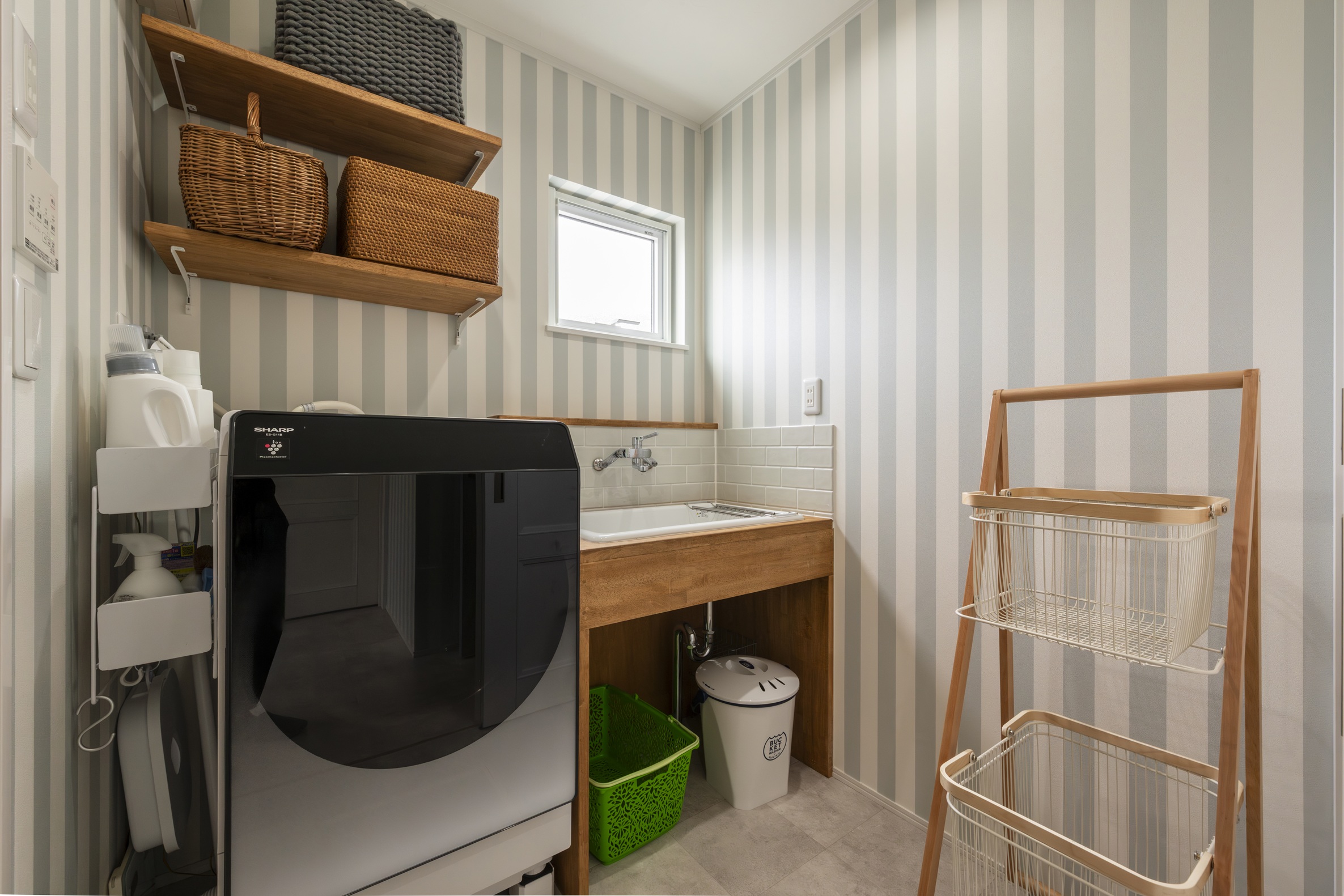 水回りはランドリースペースを兼ねた明るい空間になっており、乾燥・収納・家事が完結します。