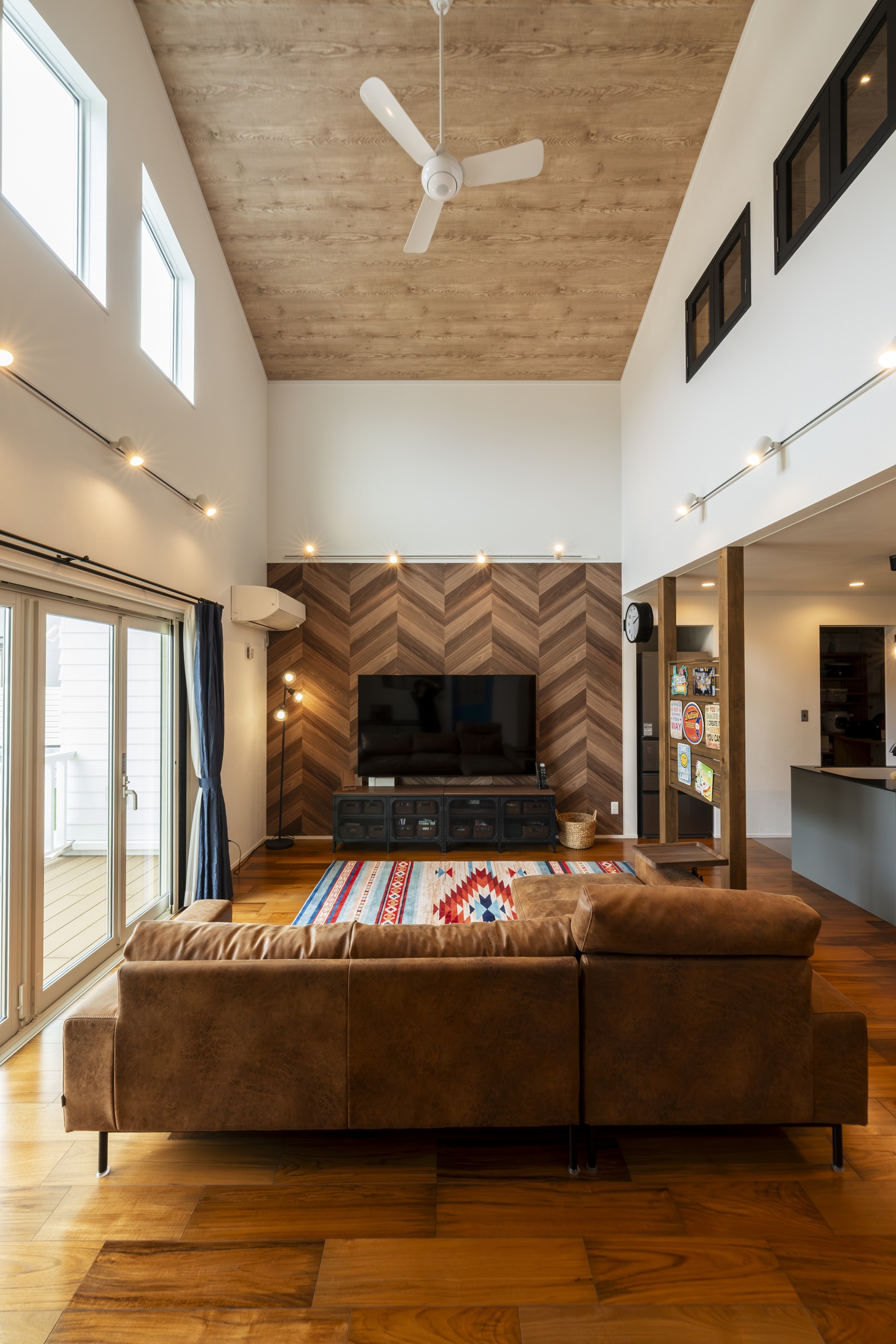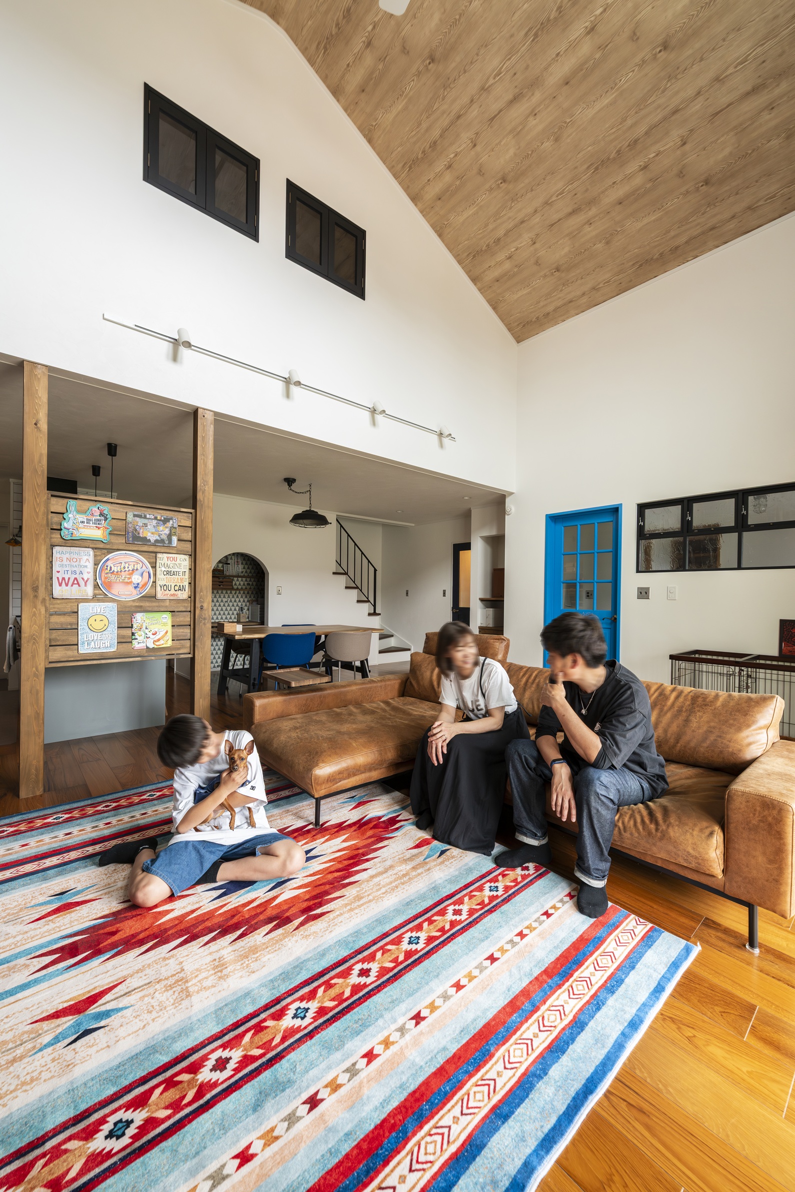 天井まで吹き抜けた開放感のあるLDKは、アカシアの無垢床にヴィンテージライクなソファやインディアンラグが映える空間。