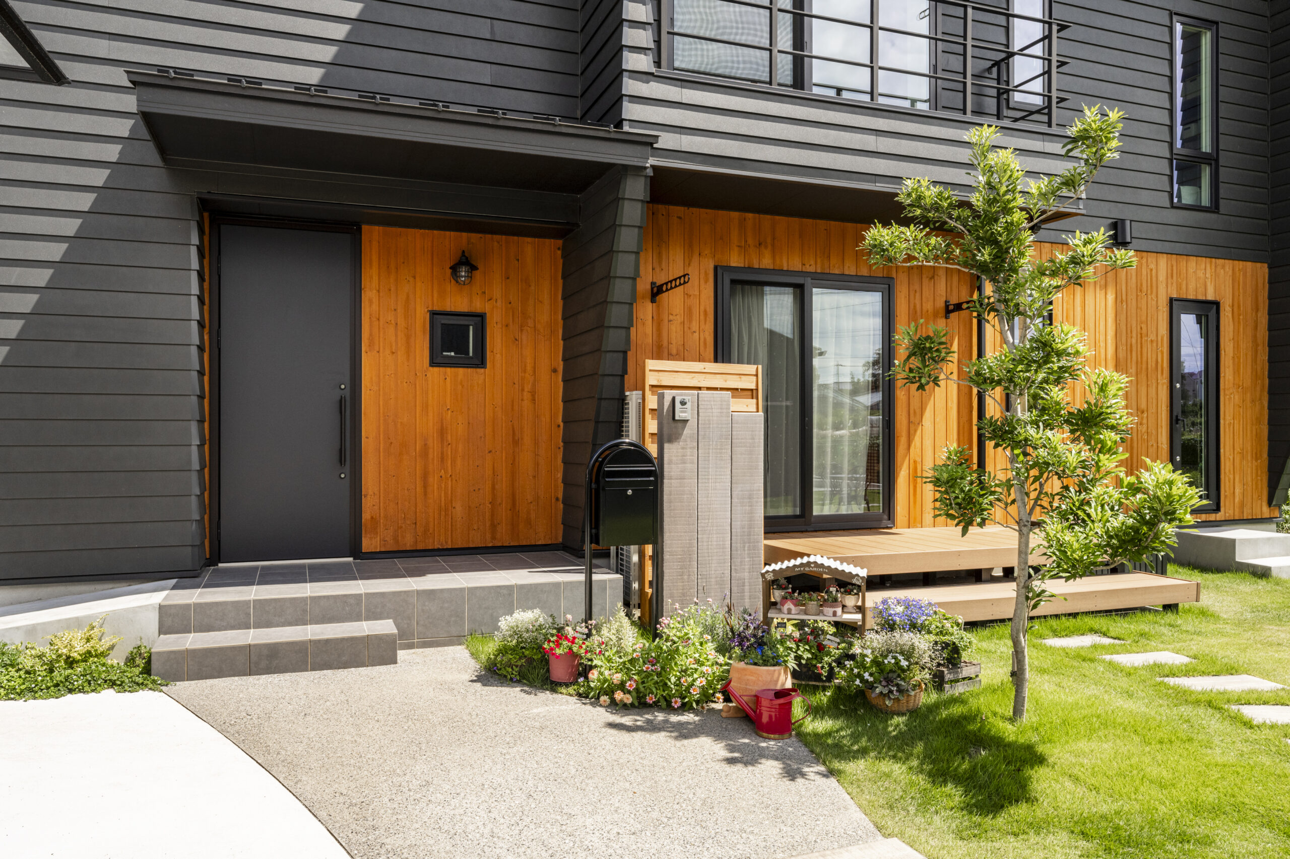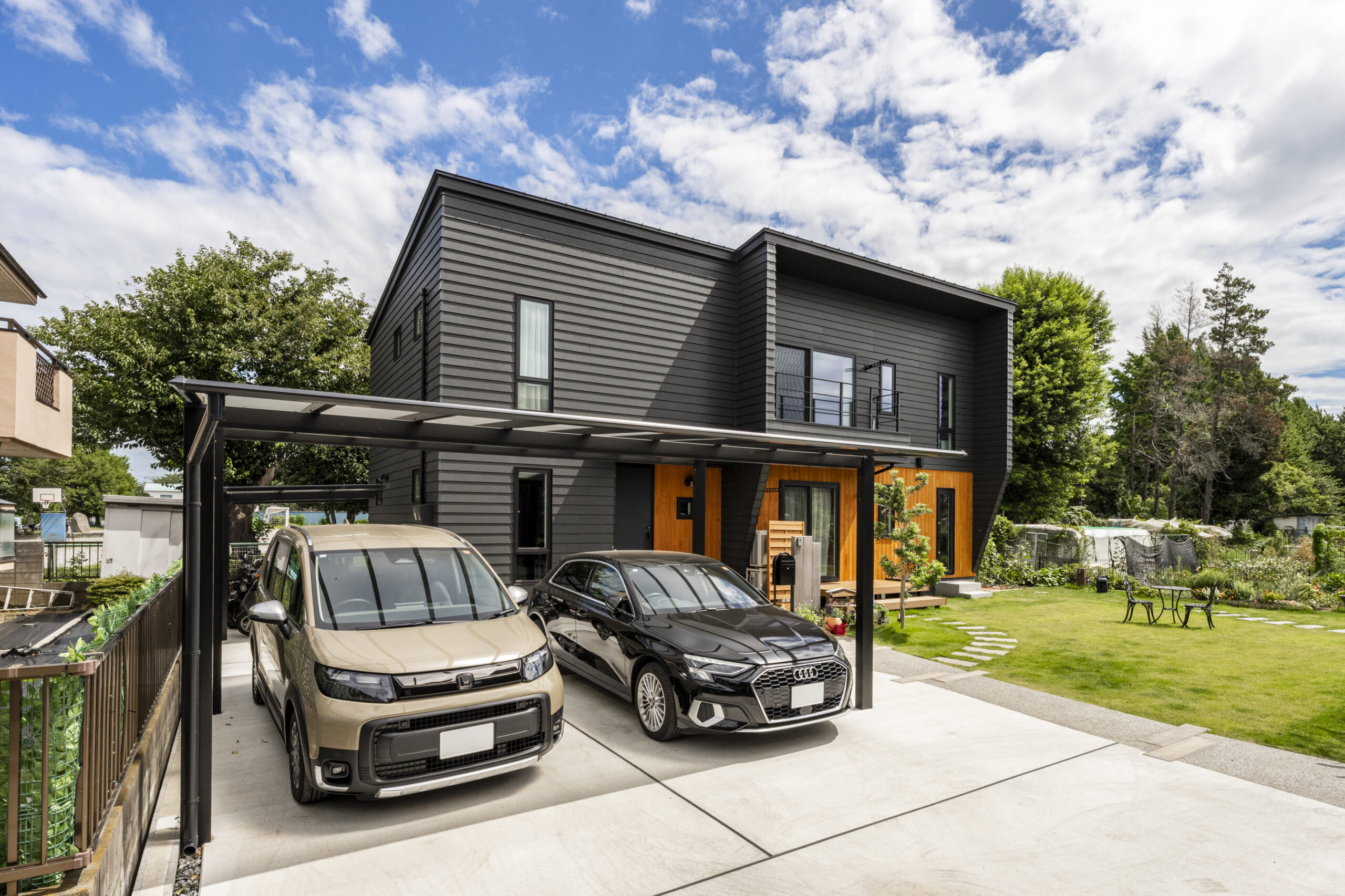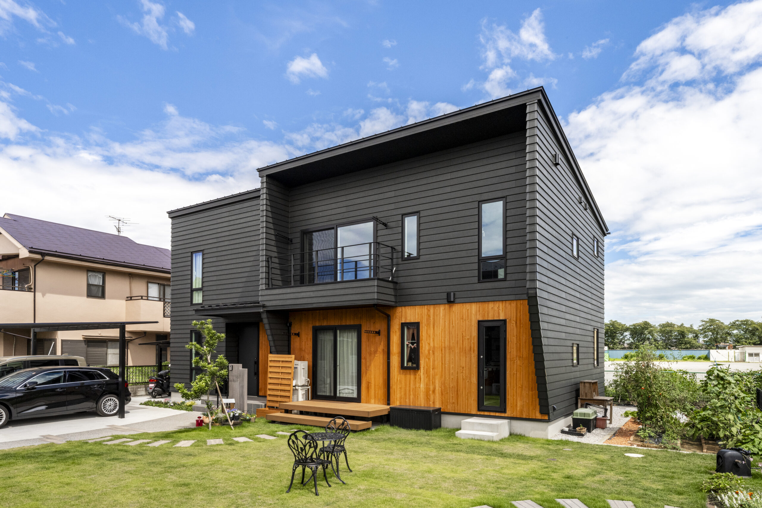 黒の外壁に木目を組み合わせたモダンな2世帯住宅。重厚感と温かみを両立させたデザインが特徴です。正面のウッドデッキは家族が集う憩いの場となり、芝生の庭と調和して開放的な雰囲気を演出。2階のバルコニーは光と風を取り込み、心地よい暮らしを支えます。