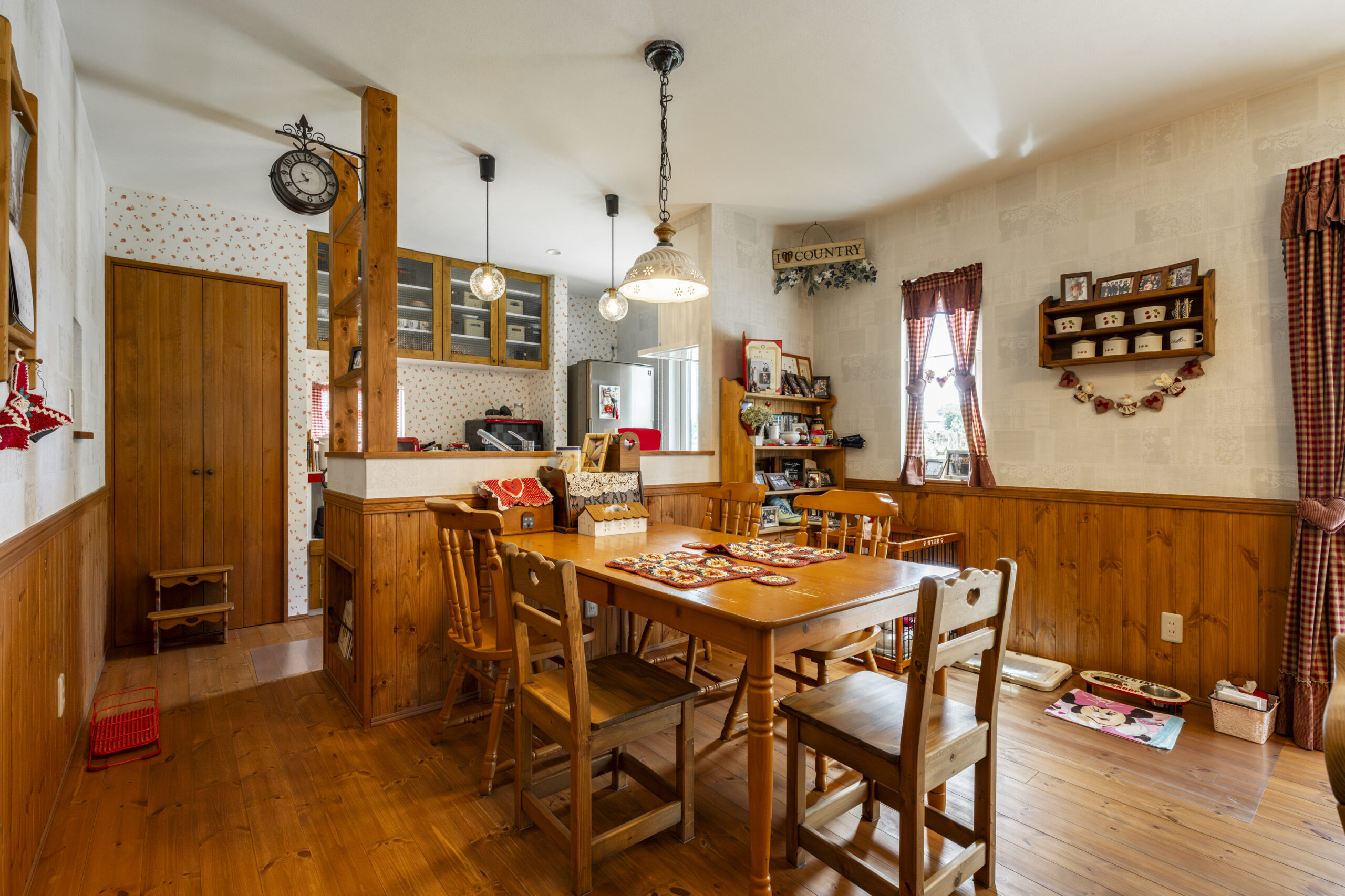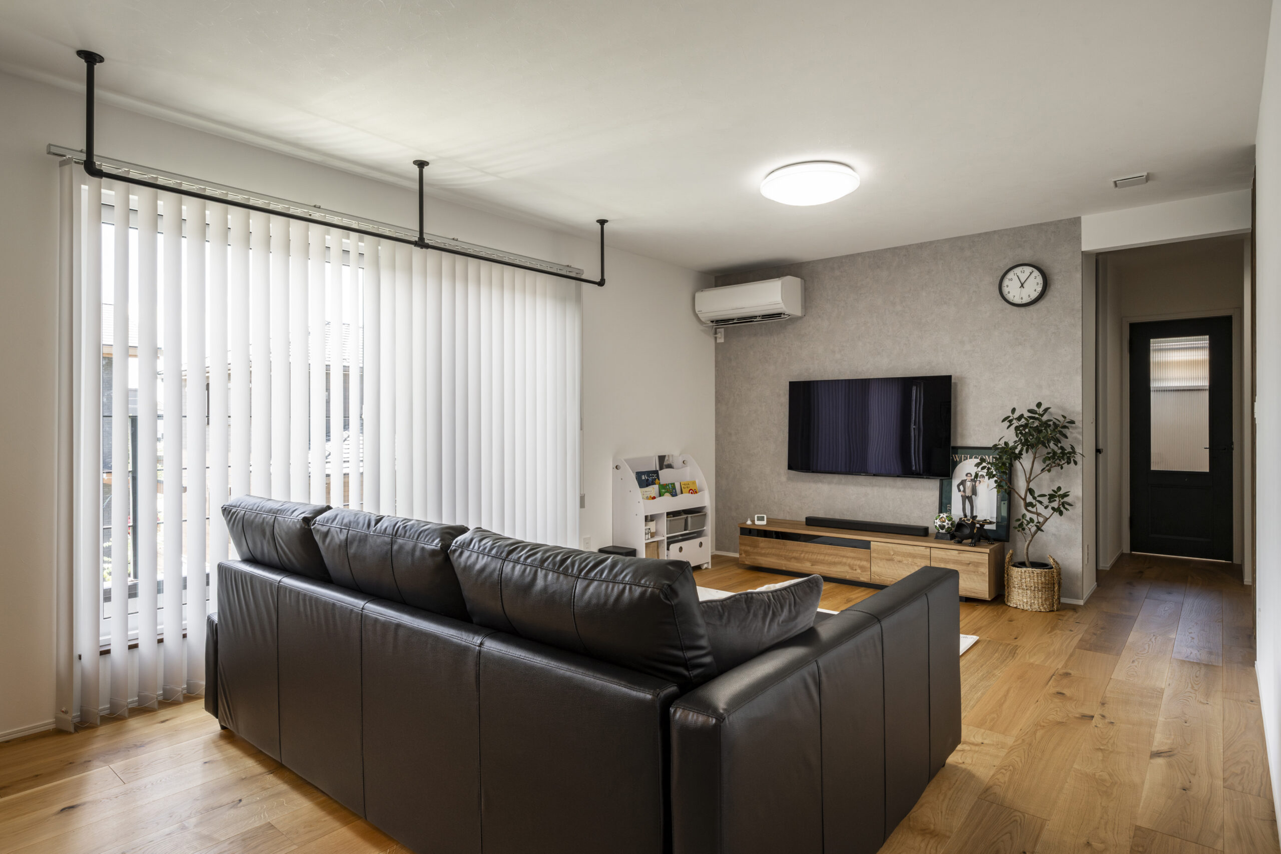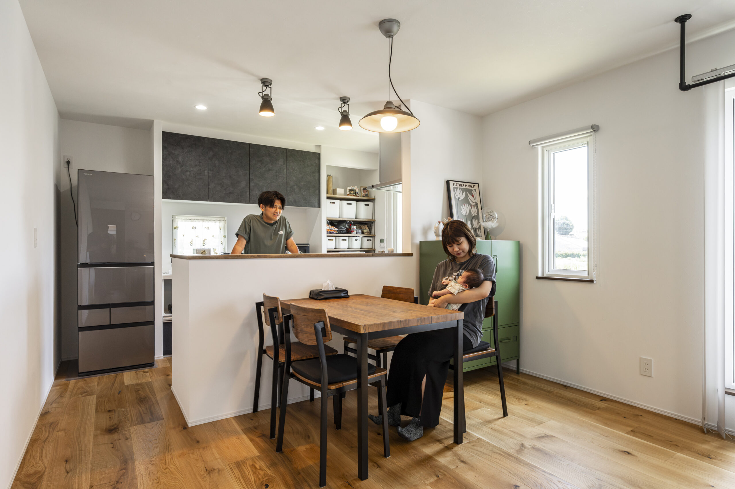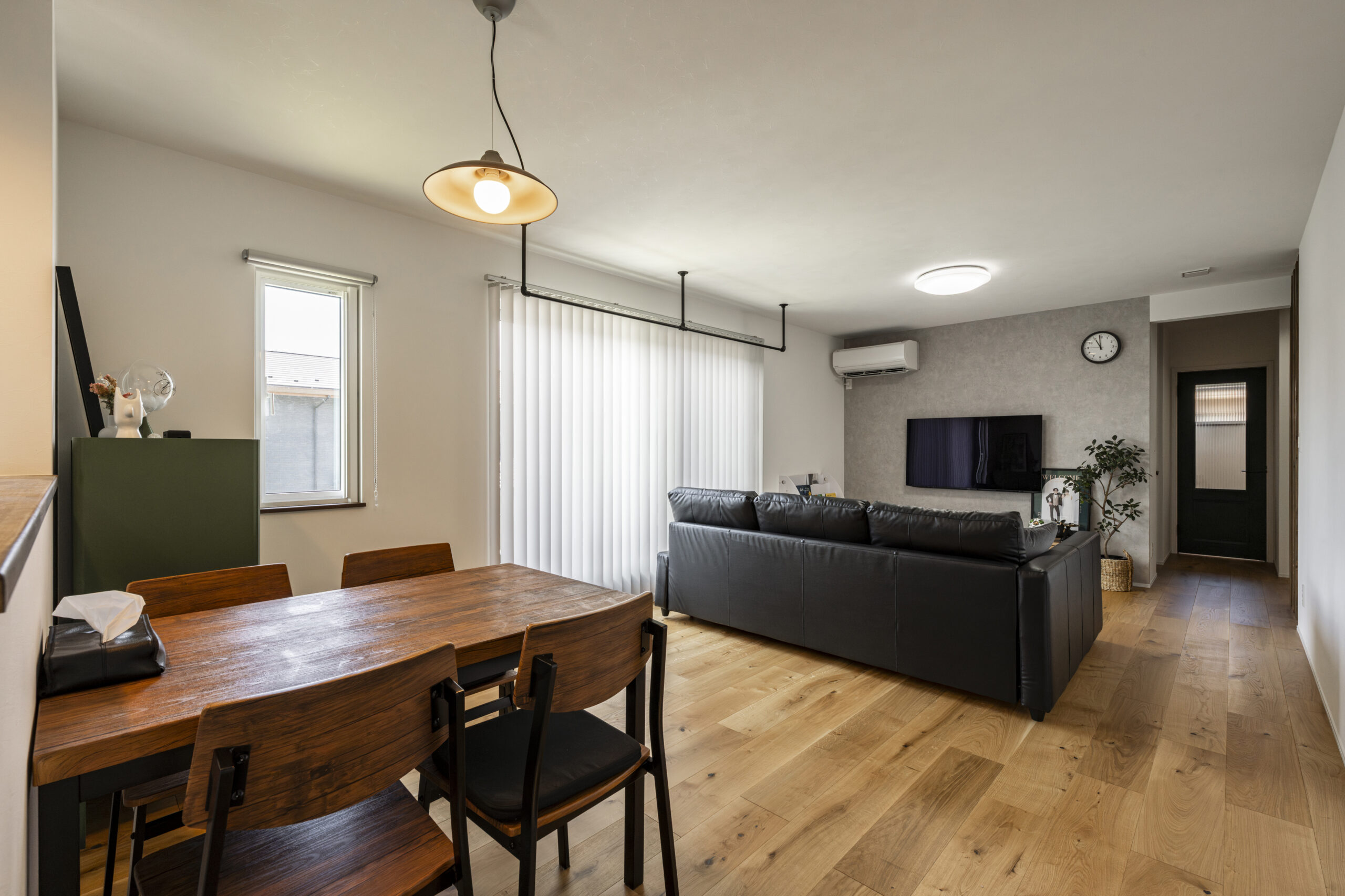 今回の二世帯住宅は、それぞれの暮らし方に合わせた個性を大切に設計しました。1階の親世帯は、木の温もりを生かしたカントリースタイルのリビングを中心に、懐かしさと安心感に包まれる空間を実現。自然と家族が集い、ゆったりと会話を楽しめる落ち着いた雰囲気に仕上げています。一方、2階の子世帯は大きな窓から光を取り込む明るく開放的なリビングを採用。シンプルでモダンな内装と効率的な動線計画により、子育て世帯が快適に暮らせる工夫を随所に盛り込みました。