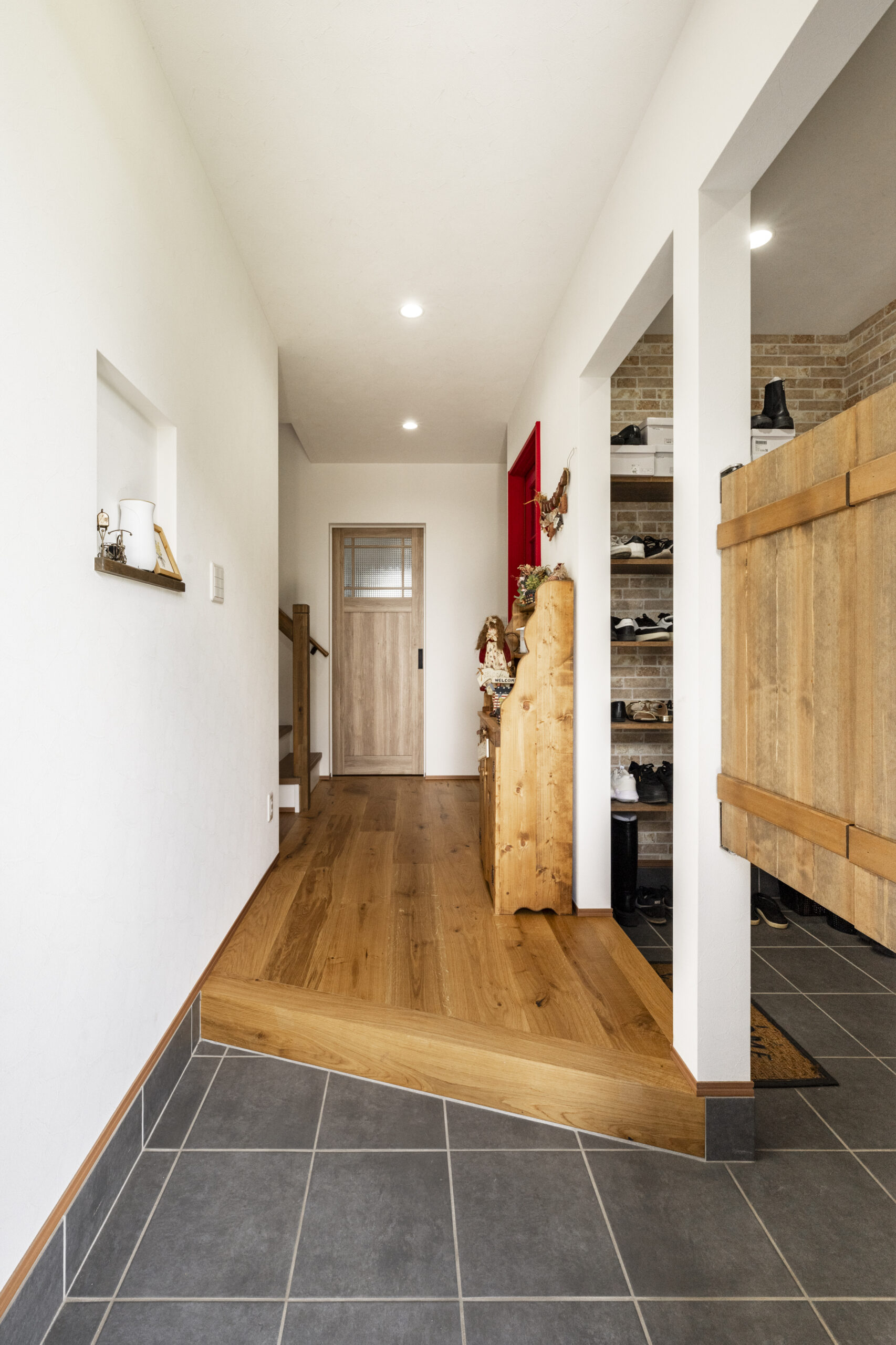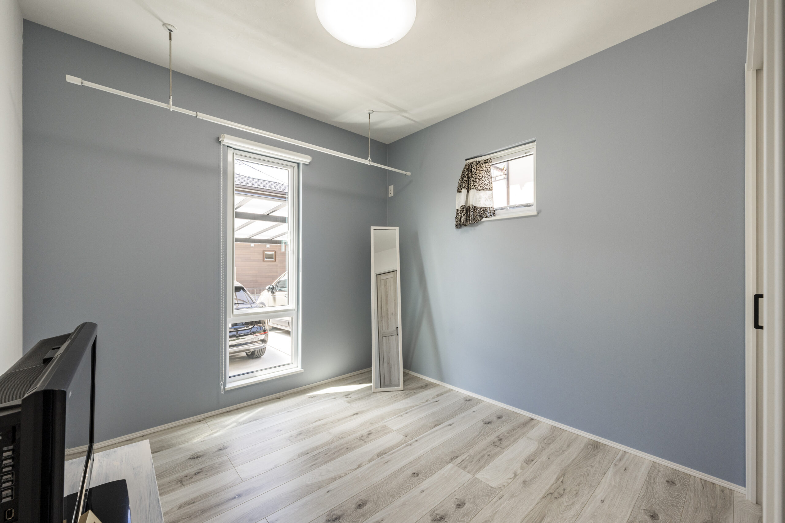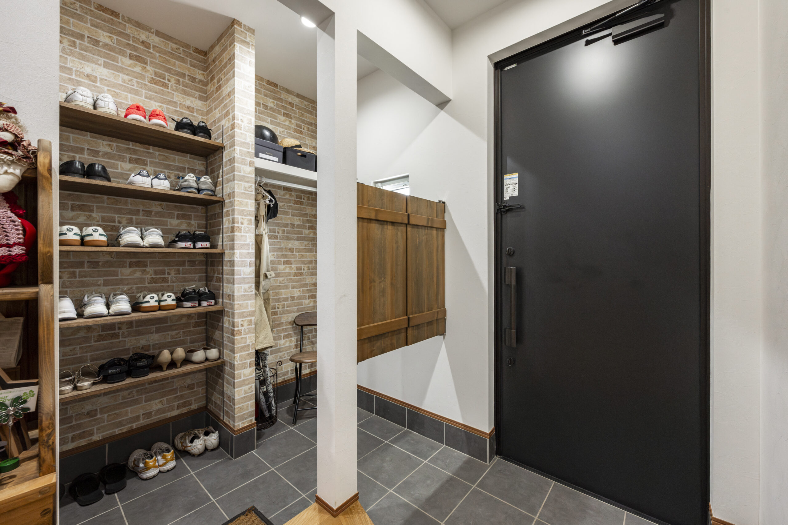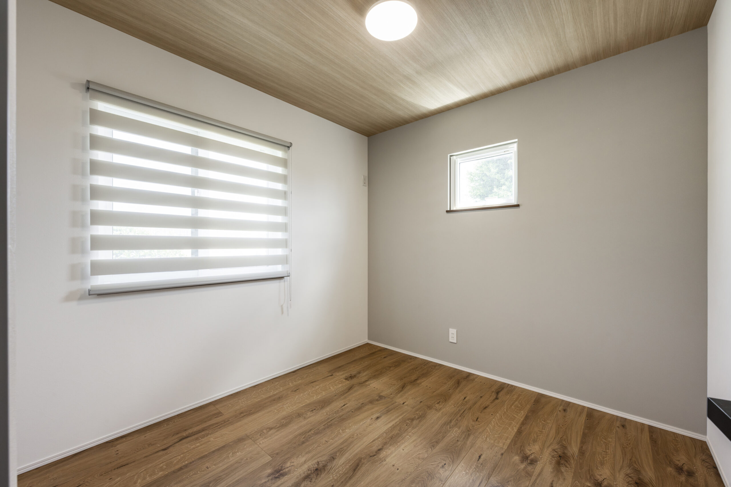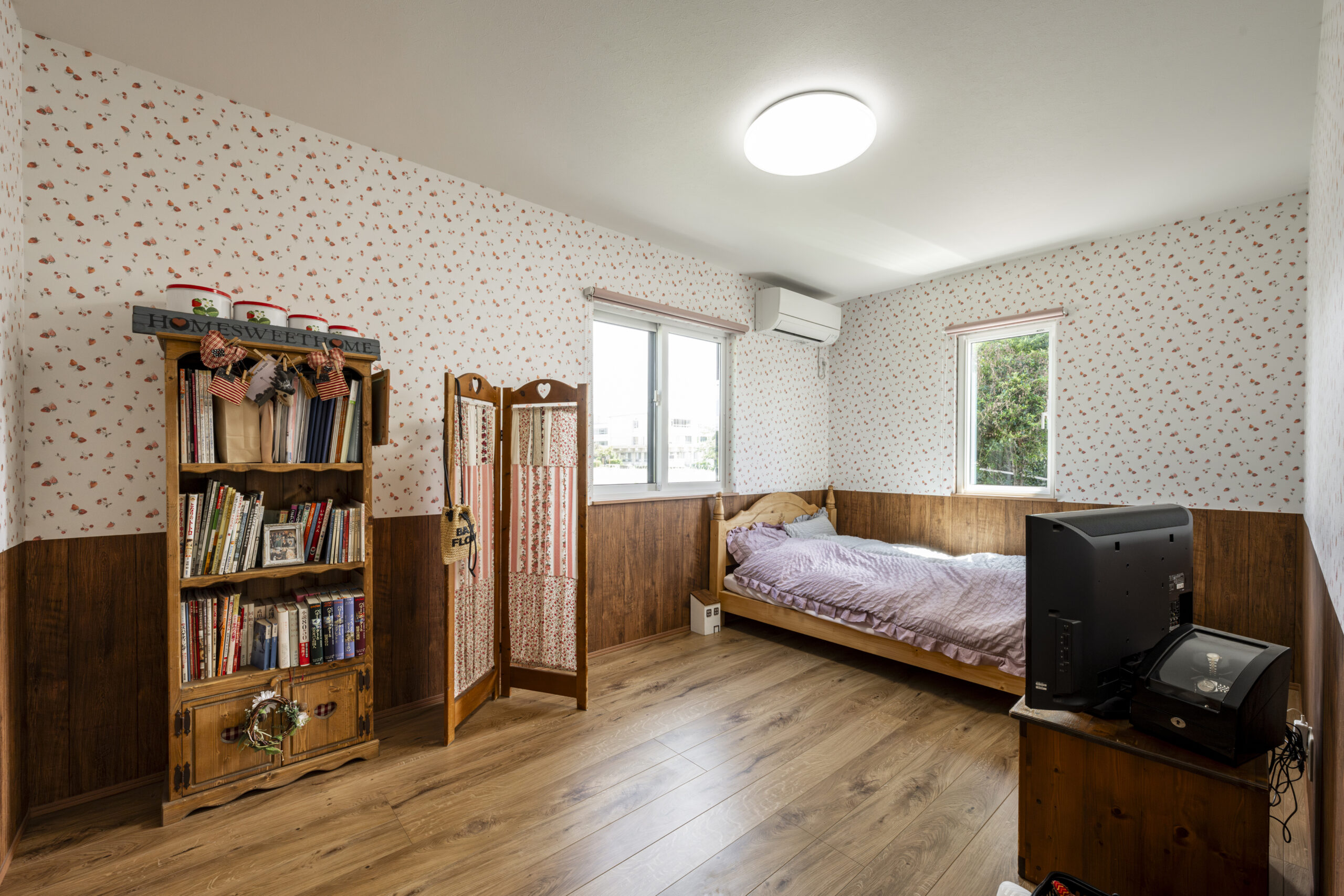 今回の二世帯住宅は、それぞれの暮らし方に合わせた個性を大切に設計しました。1階の親世帯は、木の温もりを生かしたカントリースタイルのリビングを中心に、懐かしさと安心感に包まれる空間を実現。自然と家族が集い、ゆったりと会話を楽しめる落ち着いた雰囲気に仕上げています。一方、2階の子世帯は大きな窓から光を取り込む明るく開放的なリビングを採用。シンプルでモダンな内装と効率的な動線計画により、子育て世帯が快適に暮らせる工夫を随所に盛り込みました。