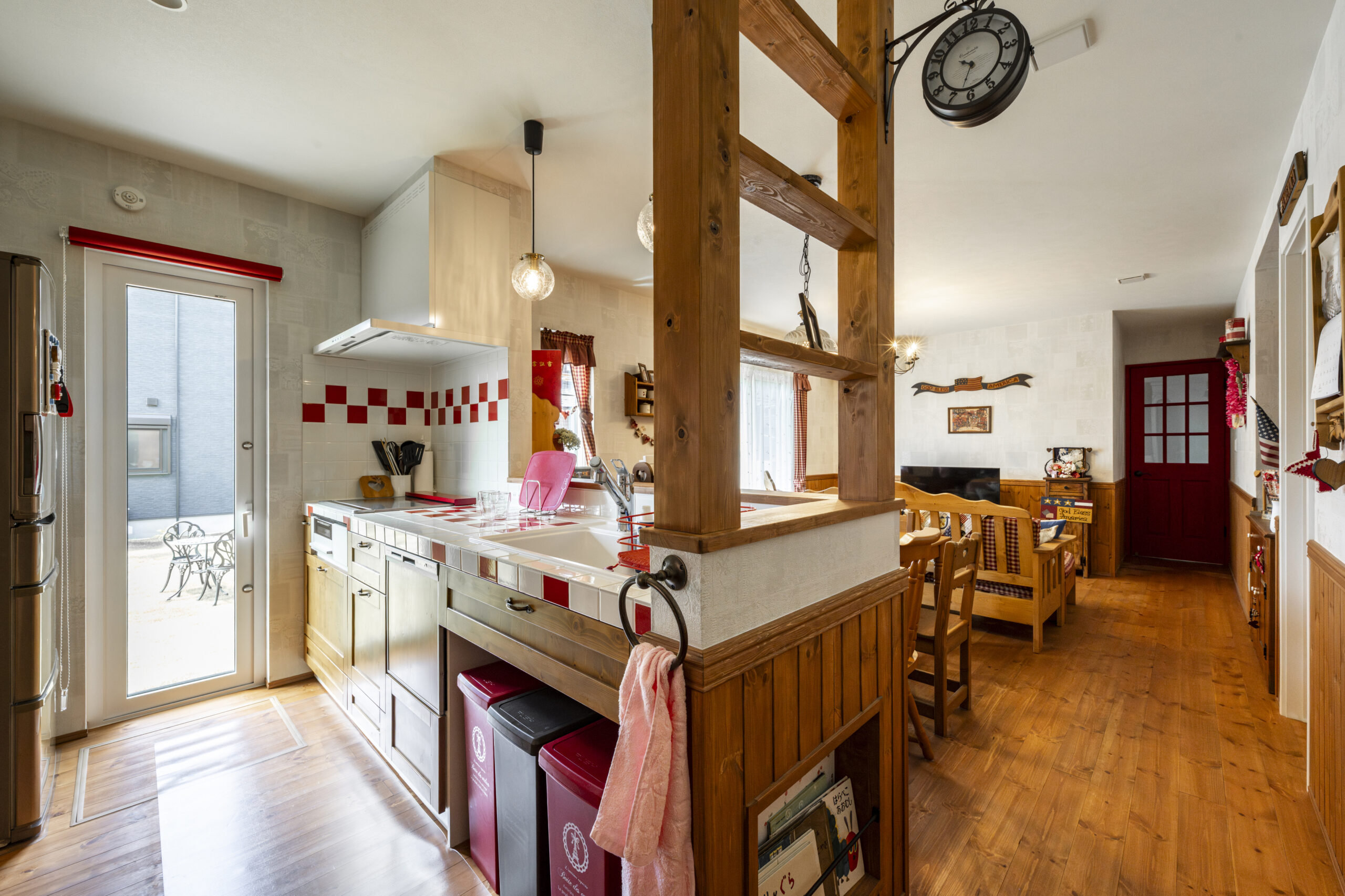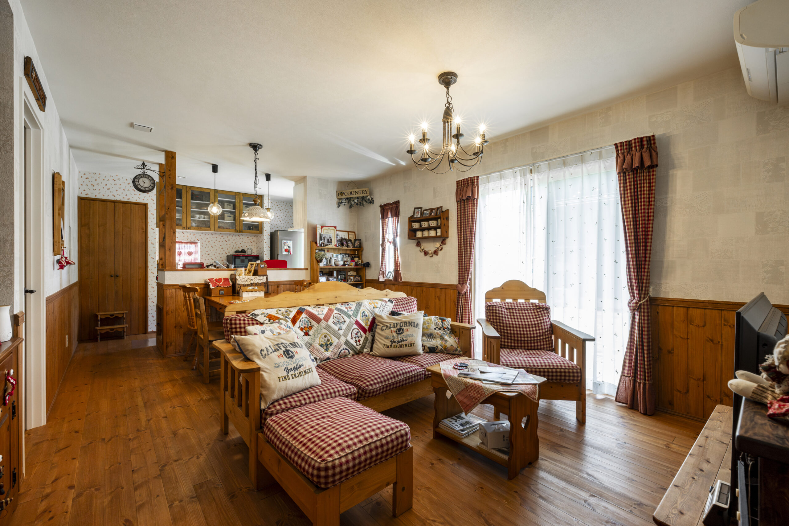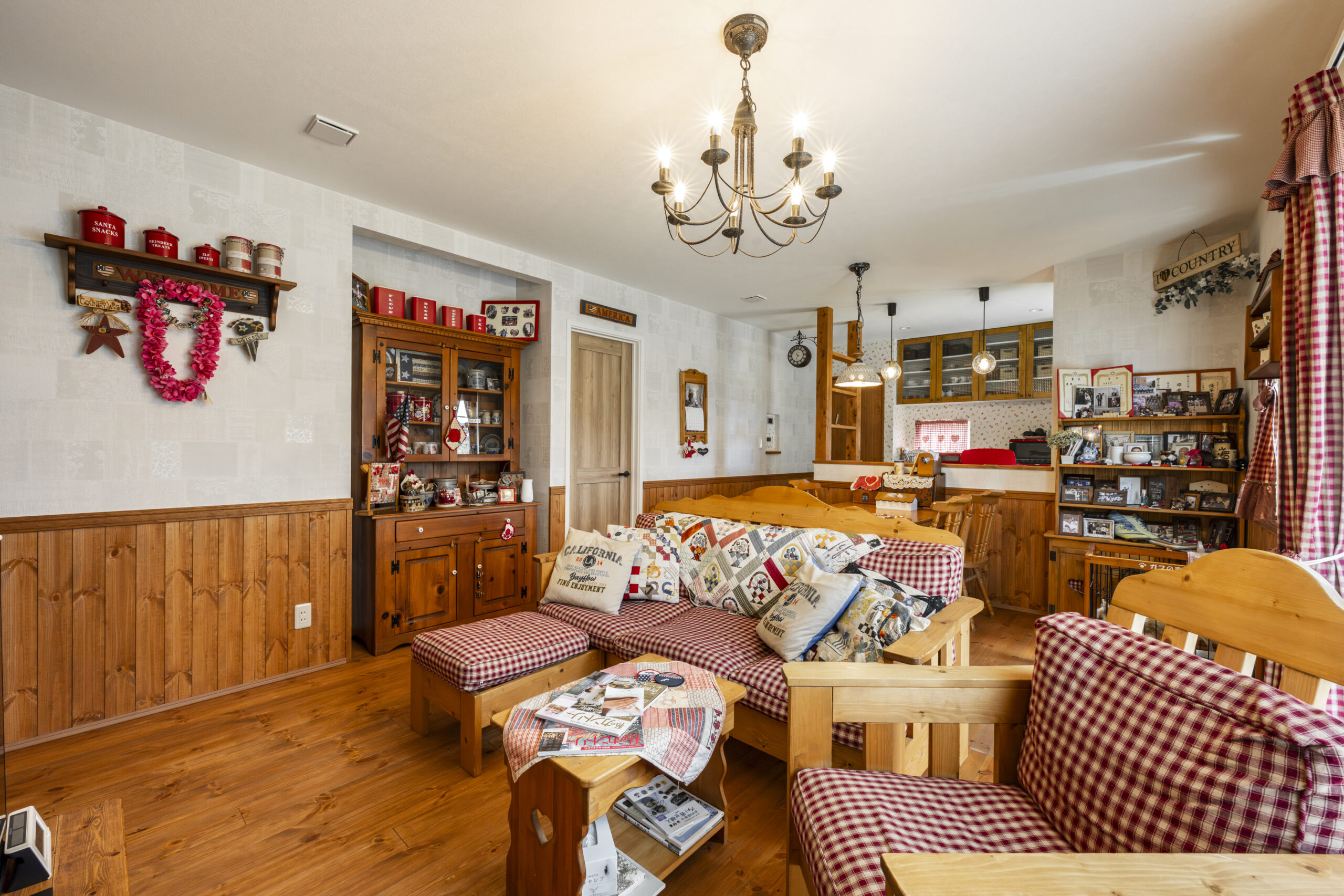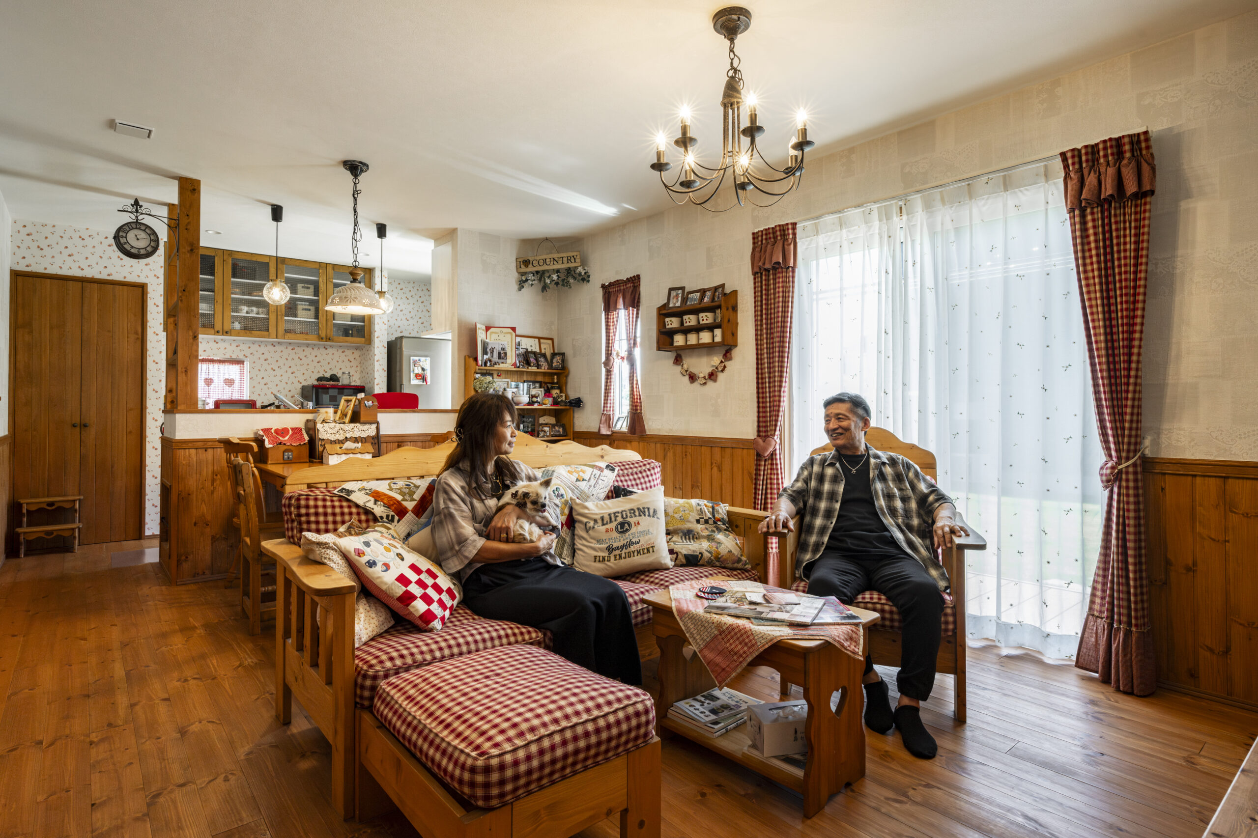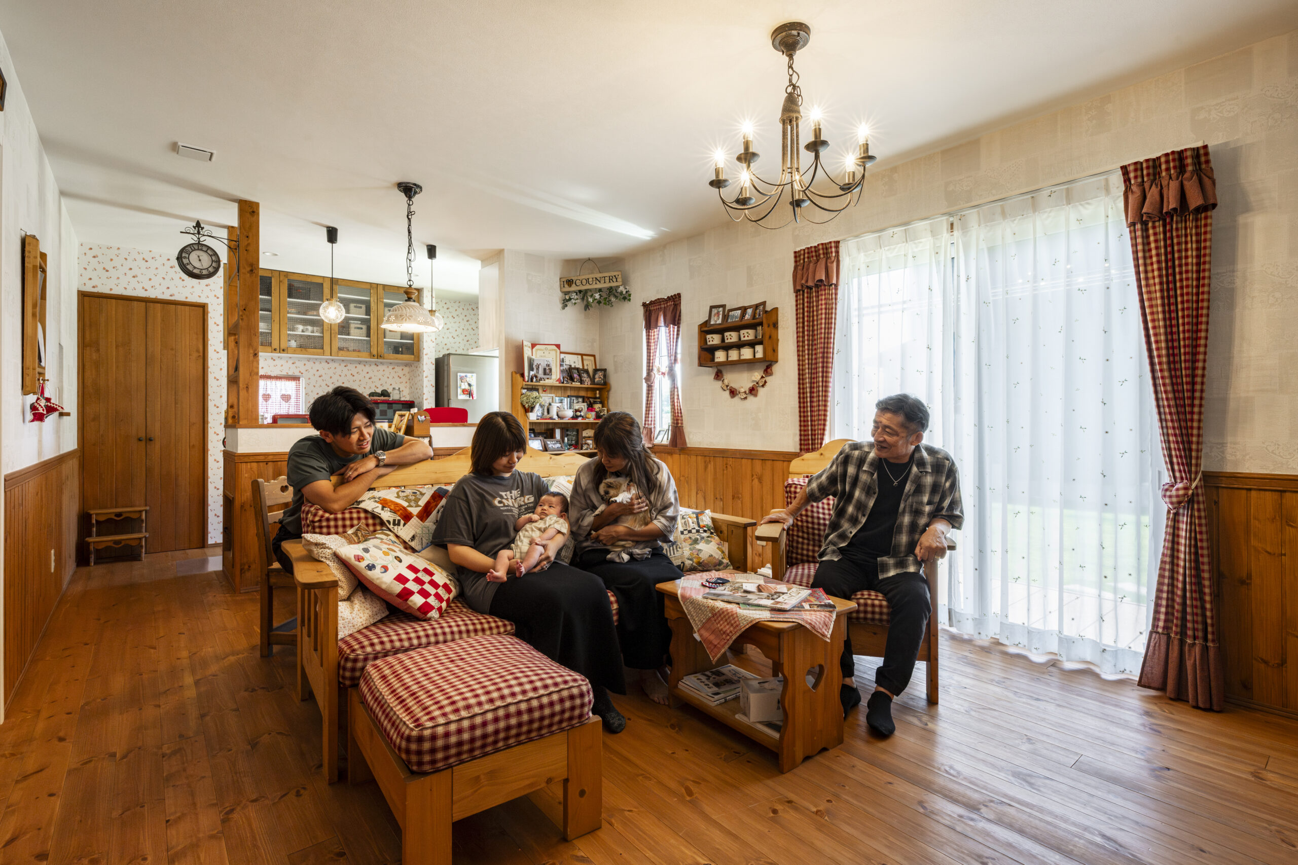 木のぬくもりが心地よい親世帯のリビングは、カントリースタイルの温かな雰囲気が魅力。赤を基調としたチェック柄のファブリックや小物使いが空間に彩りを添え、どこか懐かしい安心感を演出しています。家族が自然と集まり、会話やくつろぎの時間を楽しめる、居心地のよい空間に仕上がりました。