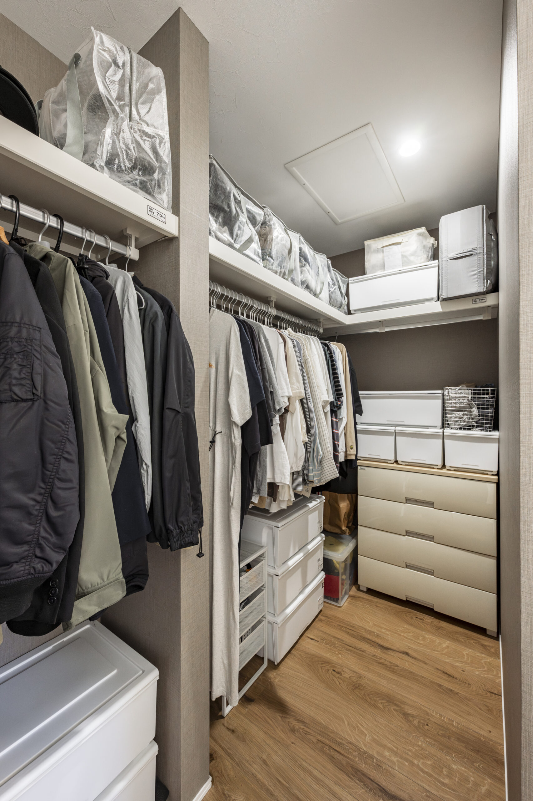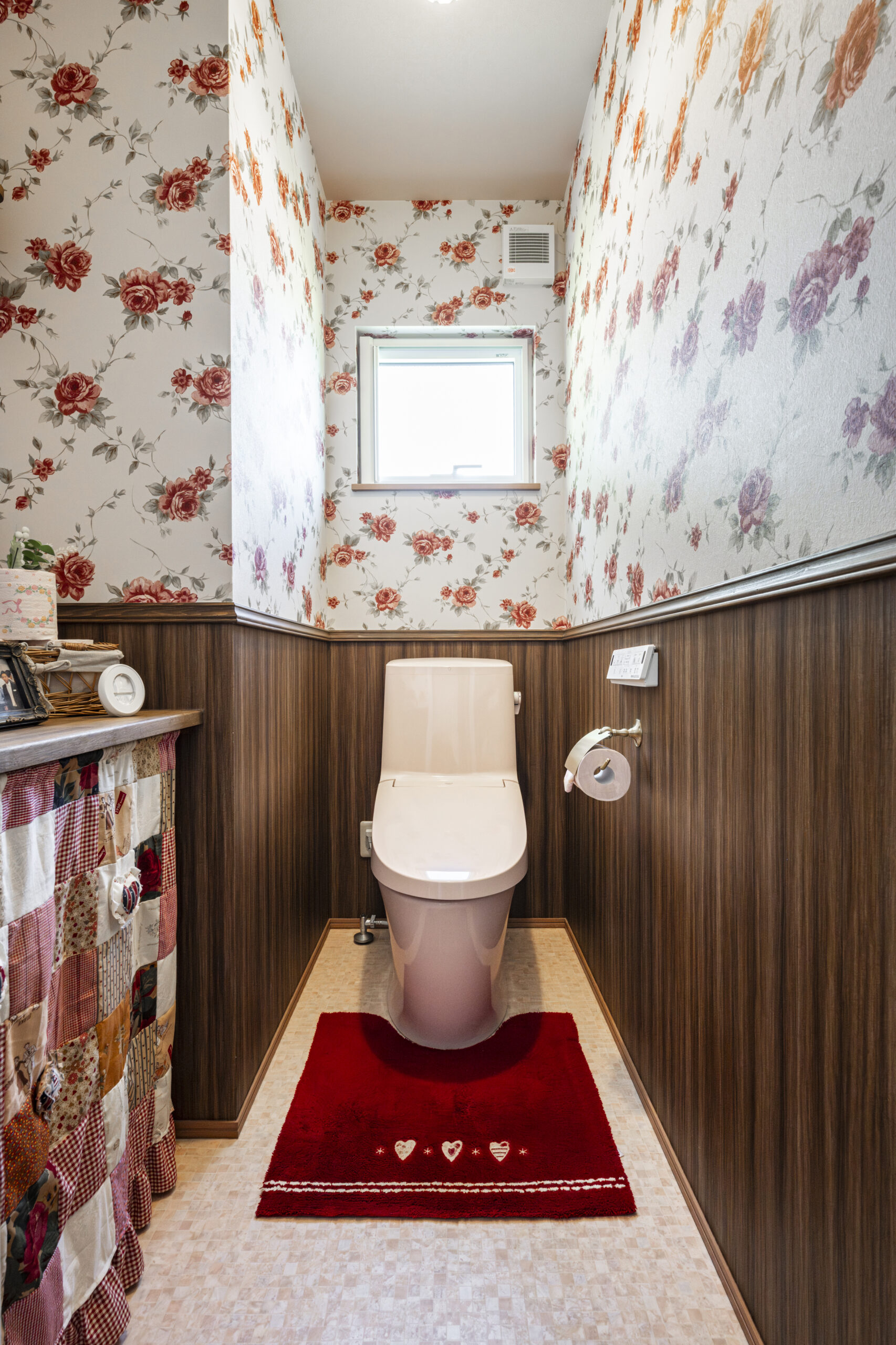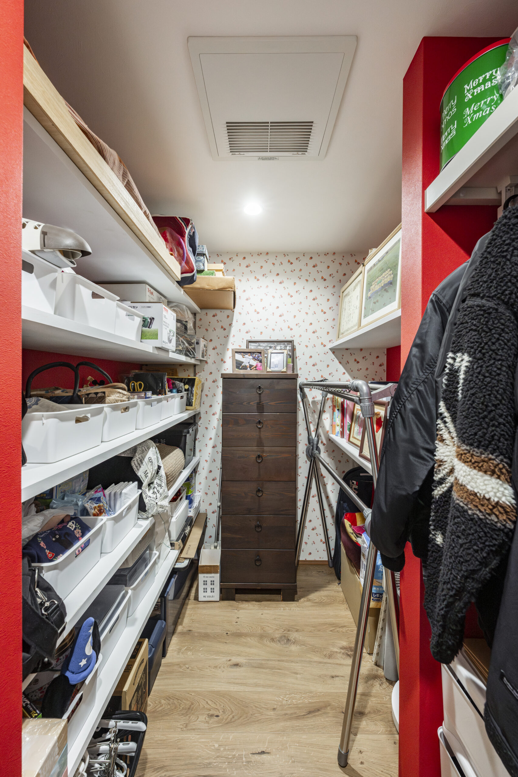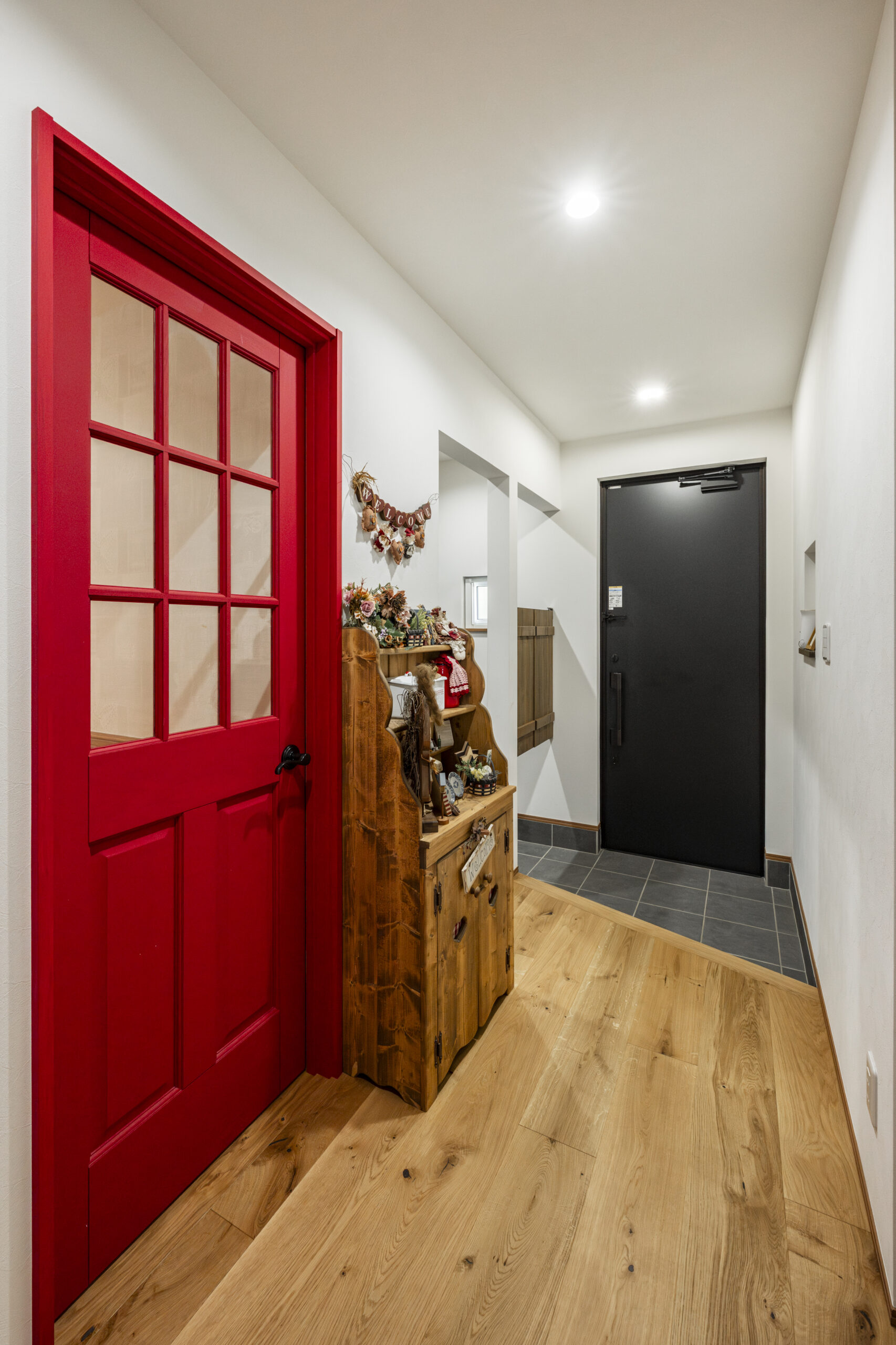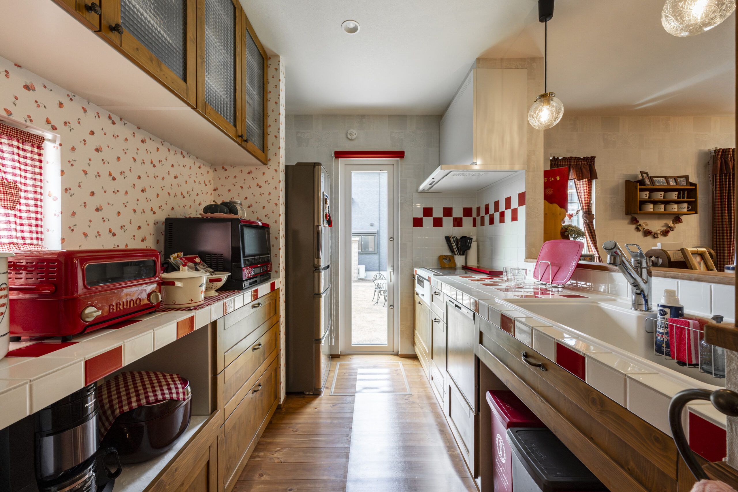 木のぬくもりが心地よい親世帯のリビングは、カントリースタイルの温かな雰囲気が魅力。赤を基調としたチェック柄のファブリックや小物使いが空間に彩りを添え、どこか懐かしい安心感を演出しています。家族が自然と集まり、会話やくつろぎの時間を楽しめる、居心地のよい空間に仕上がりました。