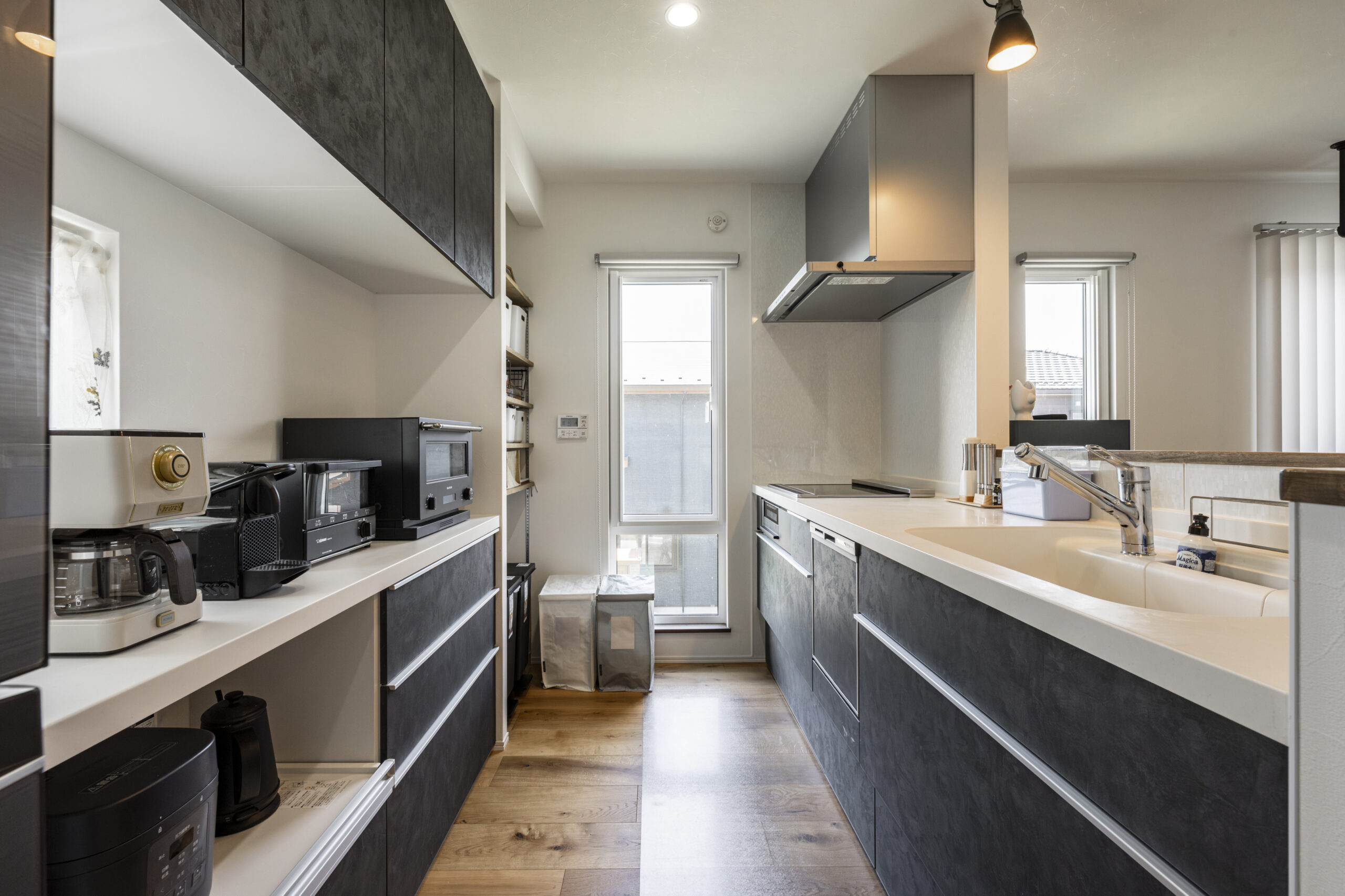2階に設けた子世帯のリビングは、大きな窓からたっぷりと光が差し込む明るく開放的な空間です。シンプルでモダンなインテリアに、ブラックのソファが引き締め役となり、落ち着きのある雰囲気を演出。キッチンとのつながりもスムーズで、家族が自然と集まりやすい間取りになっています。子どもの遊び場や読書スペースも確保し、暮らしやすさと心地よさを両立させたリビングです。